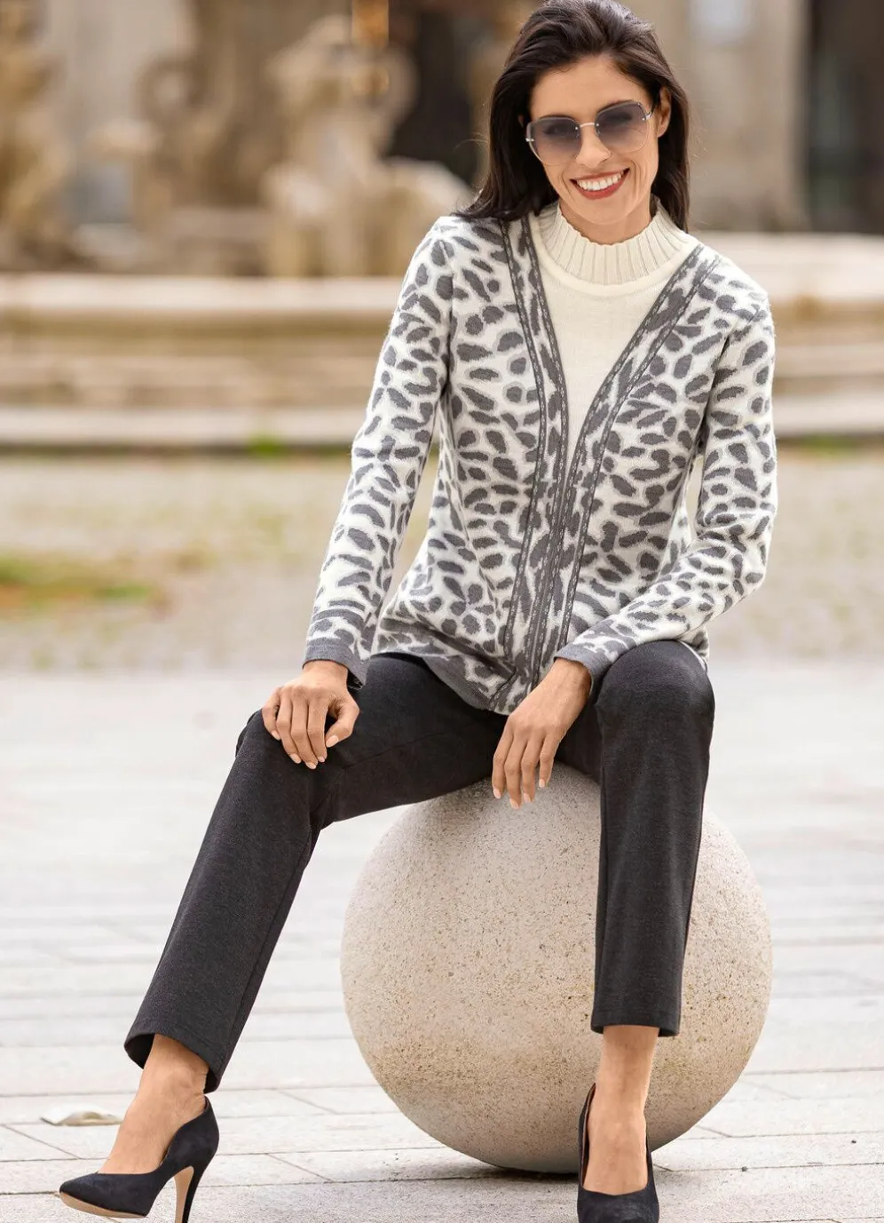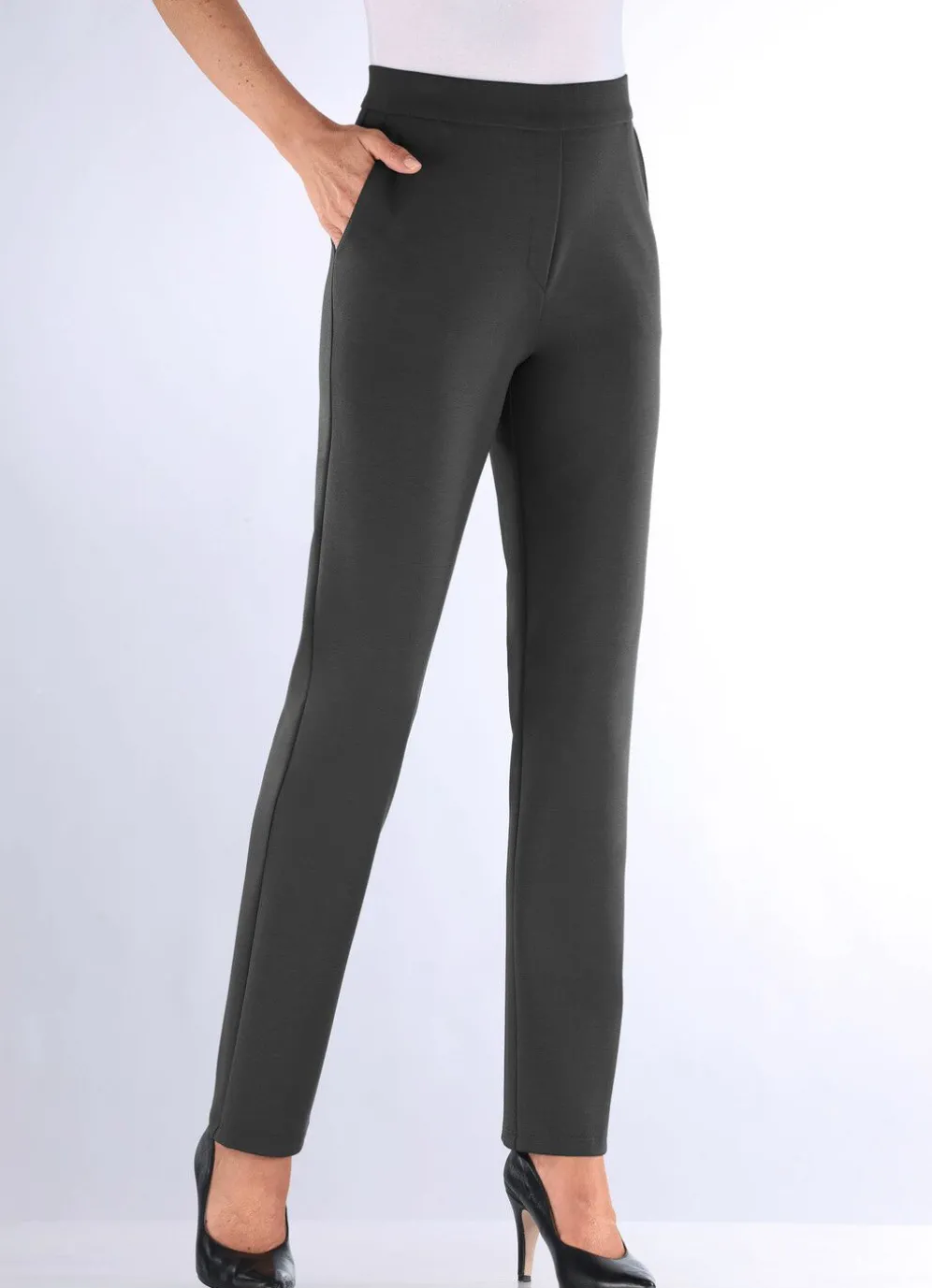 Ihr Modell BECKY – kombifreundliche Hose in bequemer Schlupfform, glatt anliegend dank des innenliegenden, unsichtbaren Rundum-Dehnbundes, Reißverschluss-Zierblende sowie Seitentaschen. Innenbeinlänge ca. 78 cm, Fußweite ab 38 cm.