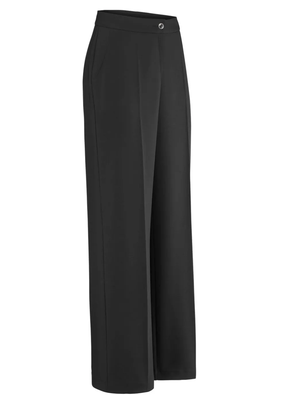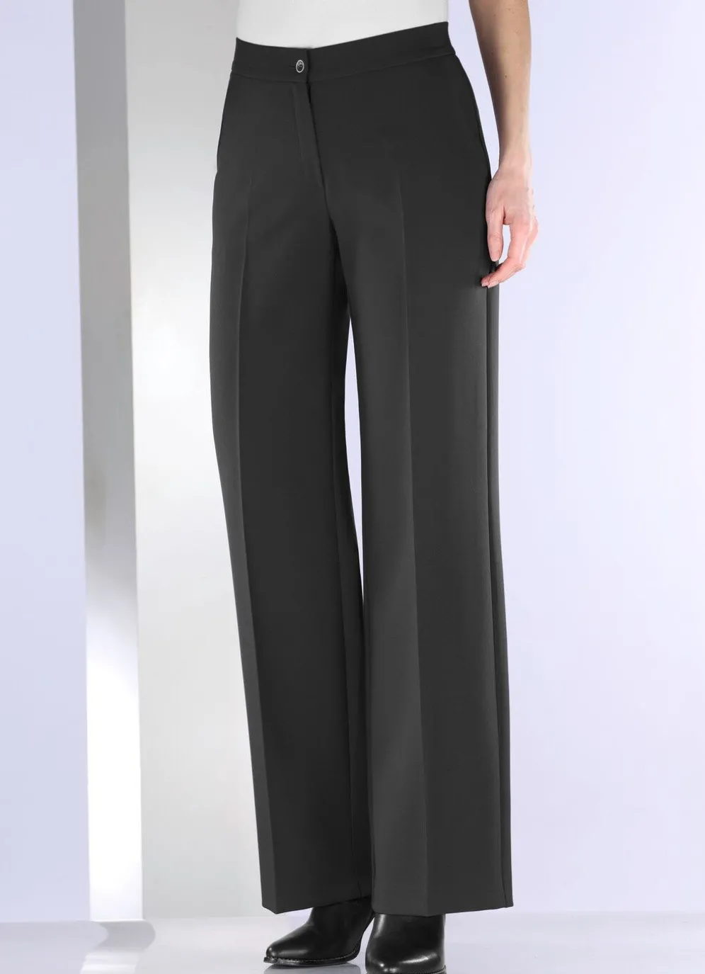 Bequeme, weite Hose mit angesetztem Bund, Knopf- und Reißverschluss, Seitentaschen sowie figurformende Abnäher im Rückteil. Innenbeinlänge ca. 80 cm, Fußweite ab 56 cm.
