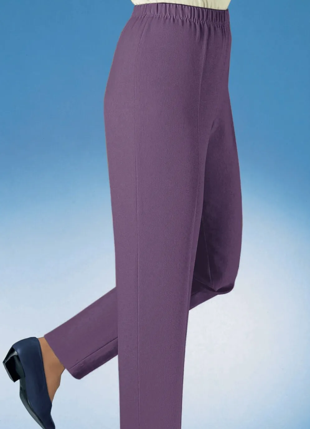 Beliebte Hose in Schlupfform, mit Dehnbund rundum sowie seitlichen Schlitzen an den Beinabschlüssen. Innenbeinlänge ca. 75 cm, Fußweite ab 39 cm.