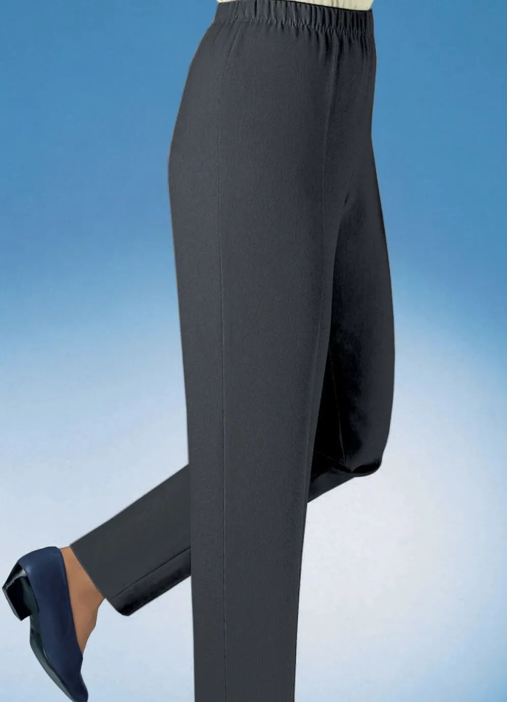 Beliebte Hose in Schlupfform, mit Dehnbund rundum sowie seitlichen Schlitzen an den Beinabschlüssen. Innenbeinlänge ca. 75 cm, Fußweite ab 39 cm.