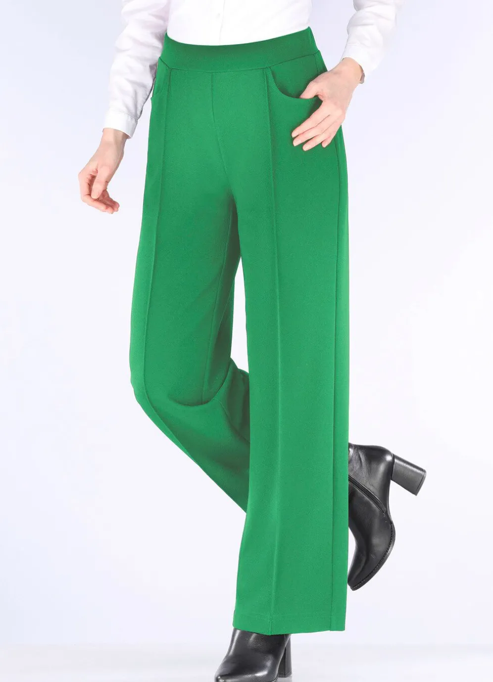 Trendgenaue Hose in modischer Weite: bequeme Schlupfform, glatt anliegend dank des innenliegenden Rundum-Dehnbundes, abgesteppte Biesen, die für eine streckende Optik sorgen sowie Seitentaschen. Innenbeinlänge ca. 76 cm, Fußweite ab 54 cm.
