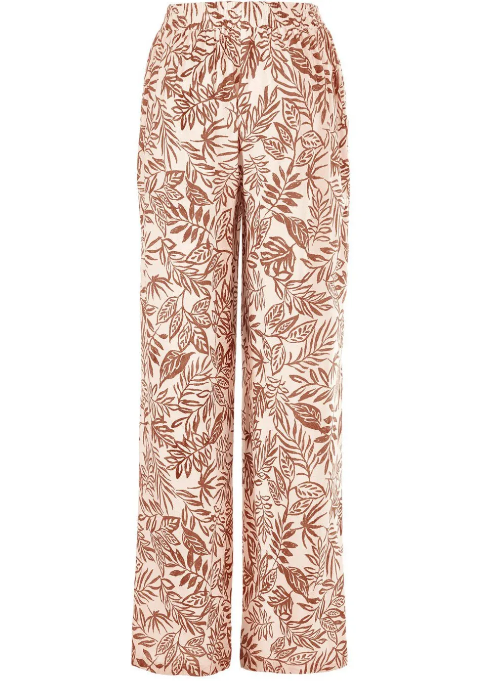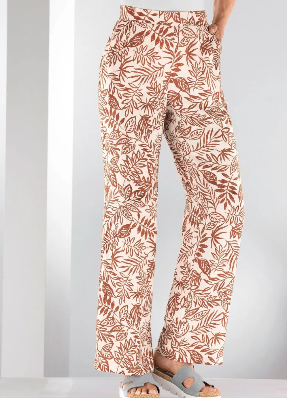 Floral dessinierte Hose in modischer Weite: komfortable Schlupfform, rückwärtiger Dehnbundeinsatz, vordere, glatte Bundverarbeitung sowie Seitentaschen. Innenbeinlänge ca. 78 cm, Fußweite ab 52 cm.