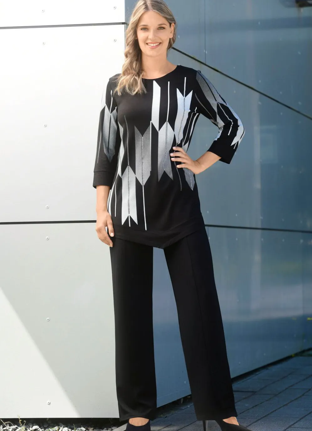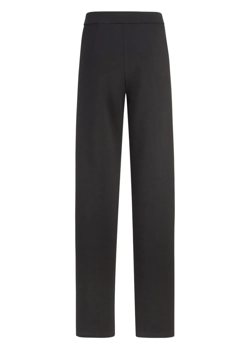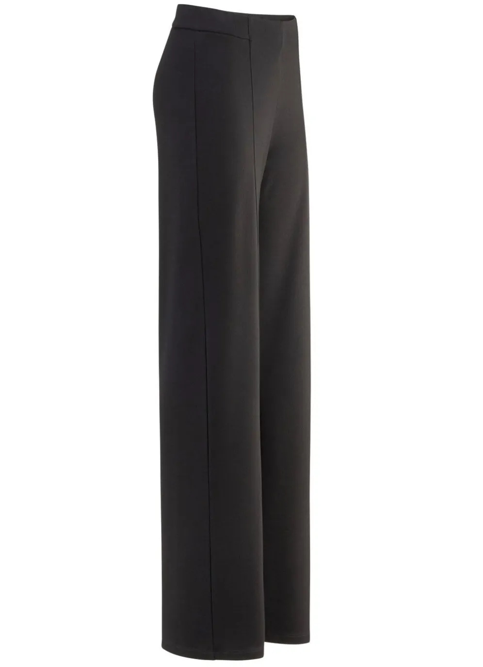 Aktuelle, schwarze Hose in modischer Weite: bequeme Schlupfform, glatt anliegend dank des innenliegenden Rundum-Dehnbundes, figurformende Abnäher unterhalb des Bundes im Rückteil sowie abgesteppte Biesen, die für eine streckende Optik sorgen. Innenbeinlänge ca. 78 cm, Fußweite ab 50 cm.