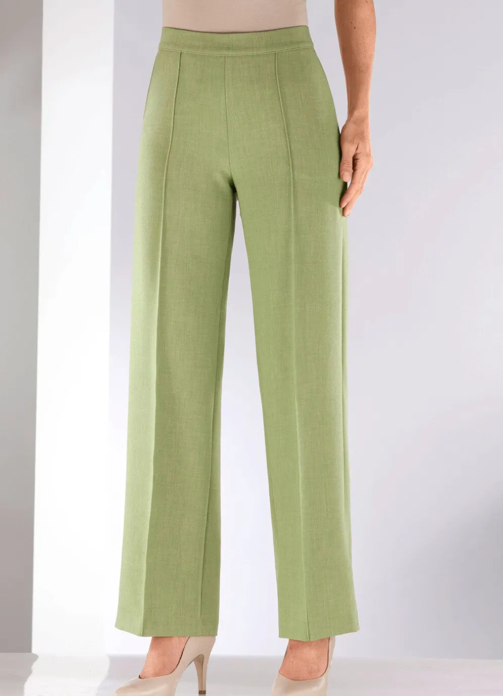 Trendgenaue Hose in modischer Weite von Stilschmiede: komfortable Schlupfform, rückwärtiger Dehnbundeinsatz, vordere, glatte Bundverarbeitung, Seitentaschen, abgesteppte Biesen im Vorderteil. Innenbeinlänge ca. 78 cm. Fußweite ab 52 cm.