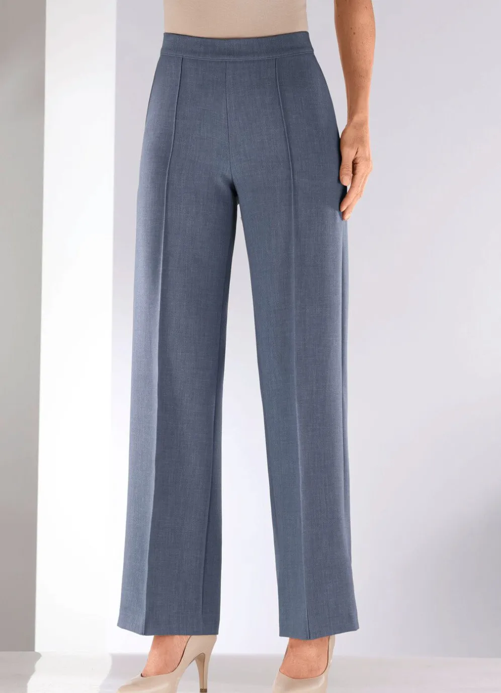 Trendgenaue Hose in modischer Weite von Stilschmiede: komfortable Schlupfform, rückwärtiger Dehnbundeinsatz, vordere, glatte Bundverarbeitung, Seitentaschen, abgesteppte Biesen im Vorderteil. Innenbeinlänge ca. 78 cm. Fußweite ab 52 cm.
