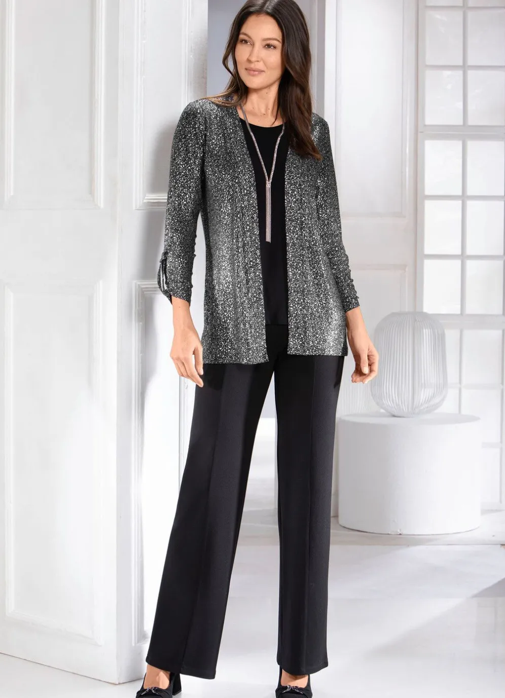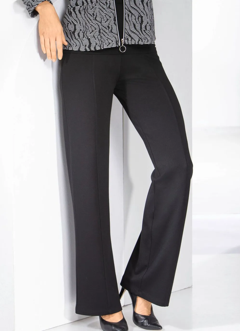 Aktuelle, schwarze Hose in modischer Weite: bequeme Schlupfform, glatt anliegend dank des innenliegenden Rundum-Dehnbundes, figurformende Abnäher unterhalb des Bundes im Rückteil sowie abgesteppte Biesen, die für eine streckende Optik sorgen. Innenbeinlänge ca. 78 cm, Fußweite ab 50 cm.