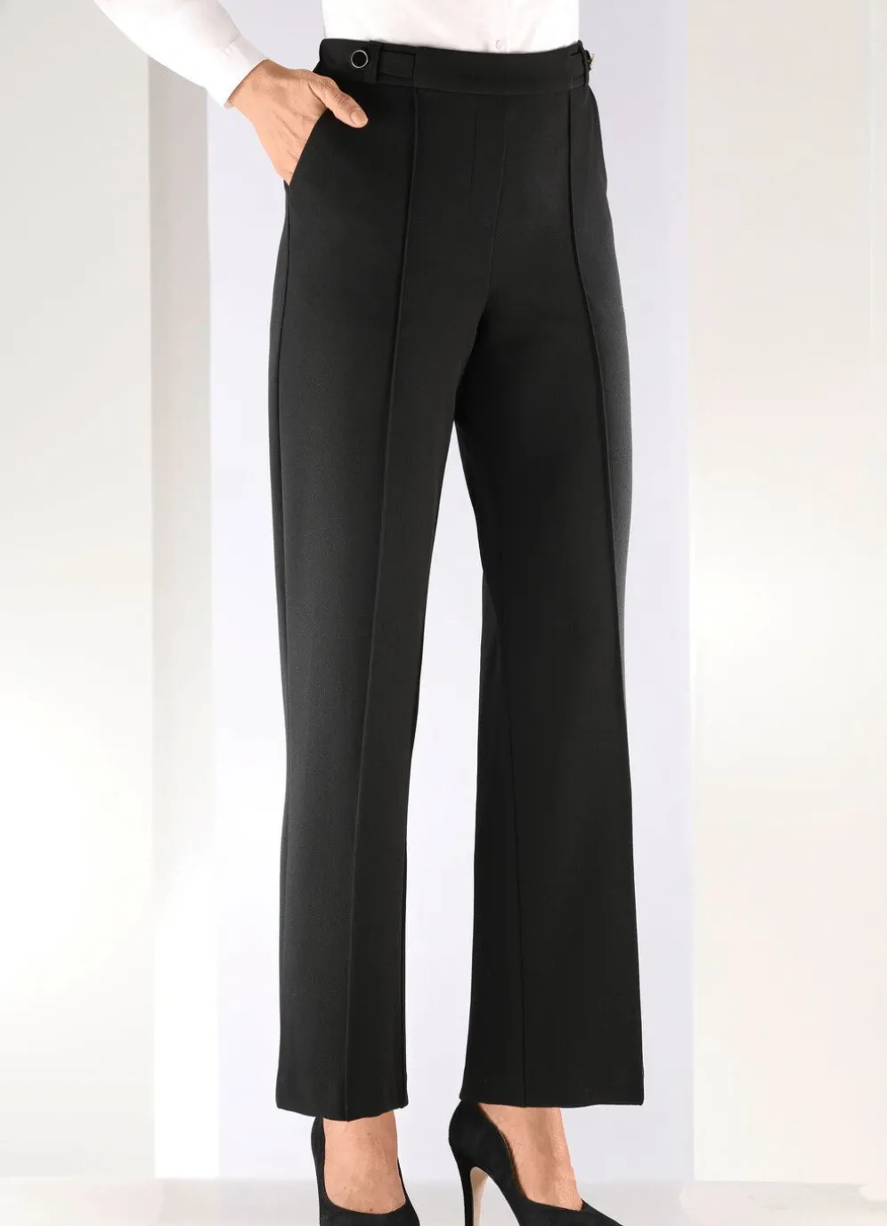 Fabelhafte Hose in modischer Weite: bequeme Schlupfform mit rückwärtigem Dehnbund und vorderer glatter Bundverarbeitung, Gürtelschlaufen, Zierriegel mit dekorativen Knöpfen vorne am Bund, angedeutete Reißverschluss-Zierblende, abgesteppte Biesen, die für eine streckende Optik sorgen sowie Seitentaschen. Innenbeinlänge ca. 78 cm, Fußweite ab 46 cm.