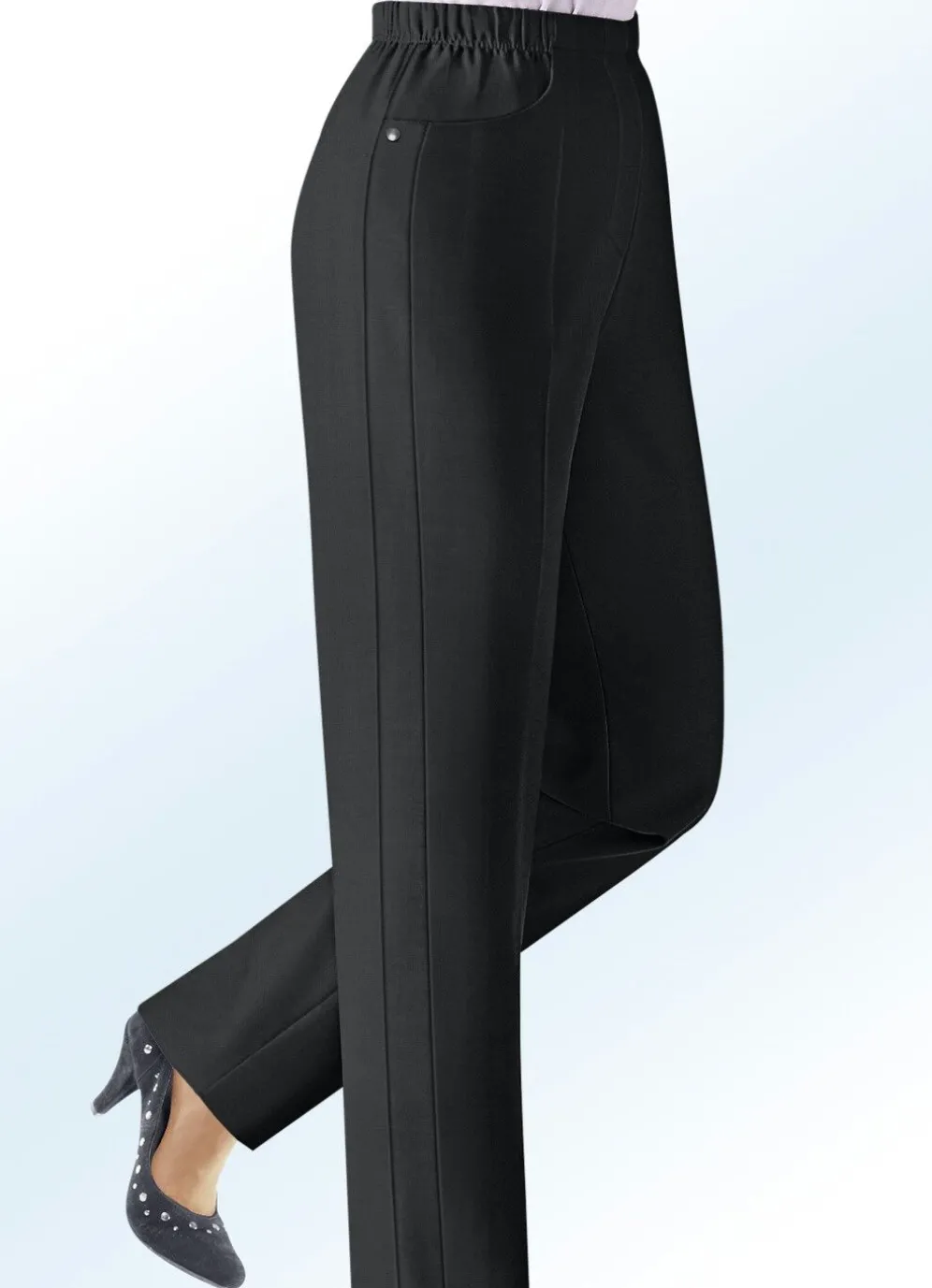 Ansprechende, der Figur schmeichelnde Hose: in bequemer Schlupfform, Dehnbund rundum mit vorderem, glattem Teilstück, Reißverschluss-Zierblende, schmückende Zierplättchen unterhalb der Seitentaschen, figurgünstige Teilungsnähte im Vorderteil, die für eine schlanke Beinsilhouette sorgen. Innenbeinlänge ca. 78 cm, Fußweite ab 39 cm.