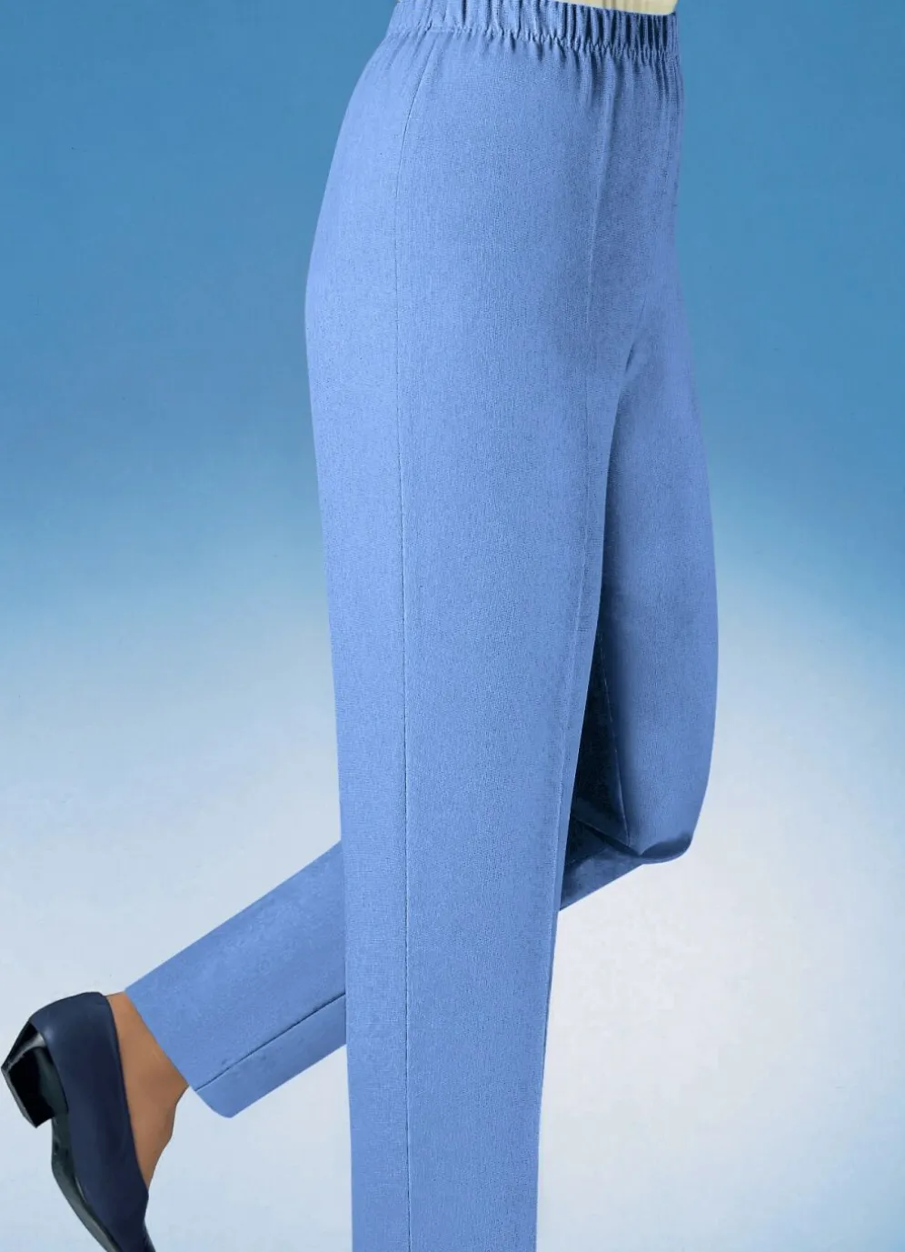 Beliebte Hose in Schlupfform: Dehnbund rundum, seitlich geschlitzte Beinabschlüsse. Innenbeinlänge ca. 75 cm, Fußweite ab 39 cm.