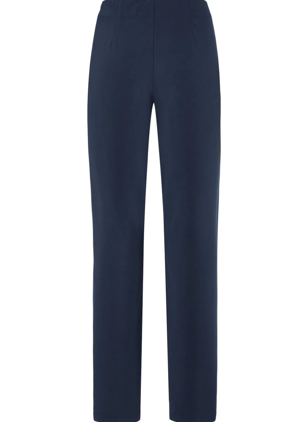 Knöchellange Hose mit angeschnittenem Bund, glatt anliegend dank der innenliegenden Gummibund-Einlage sowie abgesteppte Biesen im Vorderteil. Innenbeinlänge ca. 71 cm, Fußweite ab 30 cm.