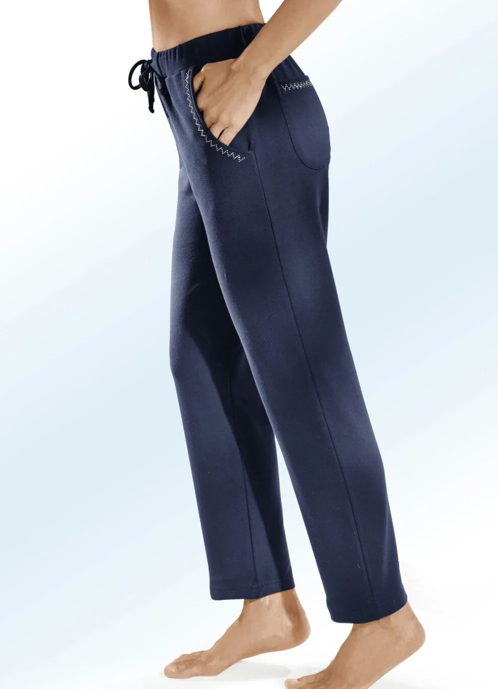 Äußerst tragangenehm ist diese attraktive Hose in langer, gerader Form, mit Tunnelzugband im Vorderteil, bequemem Dehnbund rundum sowie zwei Seitennahttaschen mit dekorativer Nietenzier.