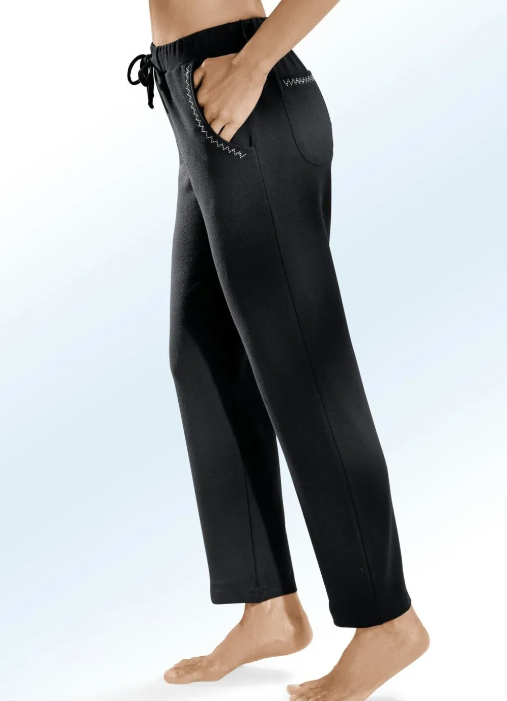 Äußerst tragangenehm ist diese attraktive Hose in langer, gerader Form, mit Tunnelzugband im Vorderteil, bequemem Dehnbund rundum sowie zwei Seitennahttaschen mit dekorativer Nietenzier.