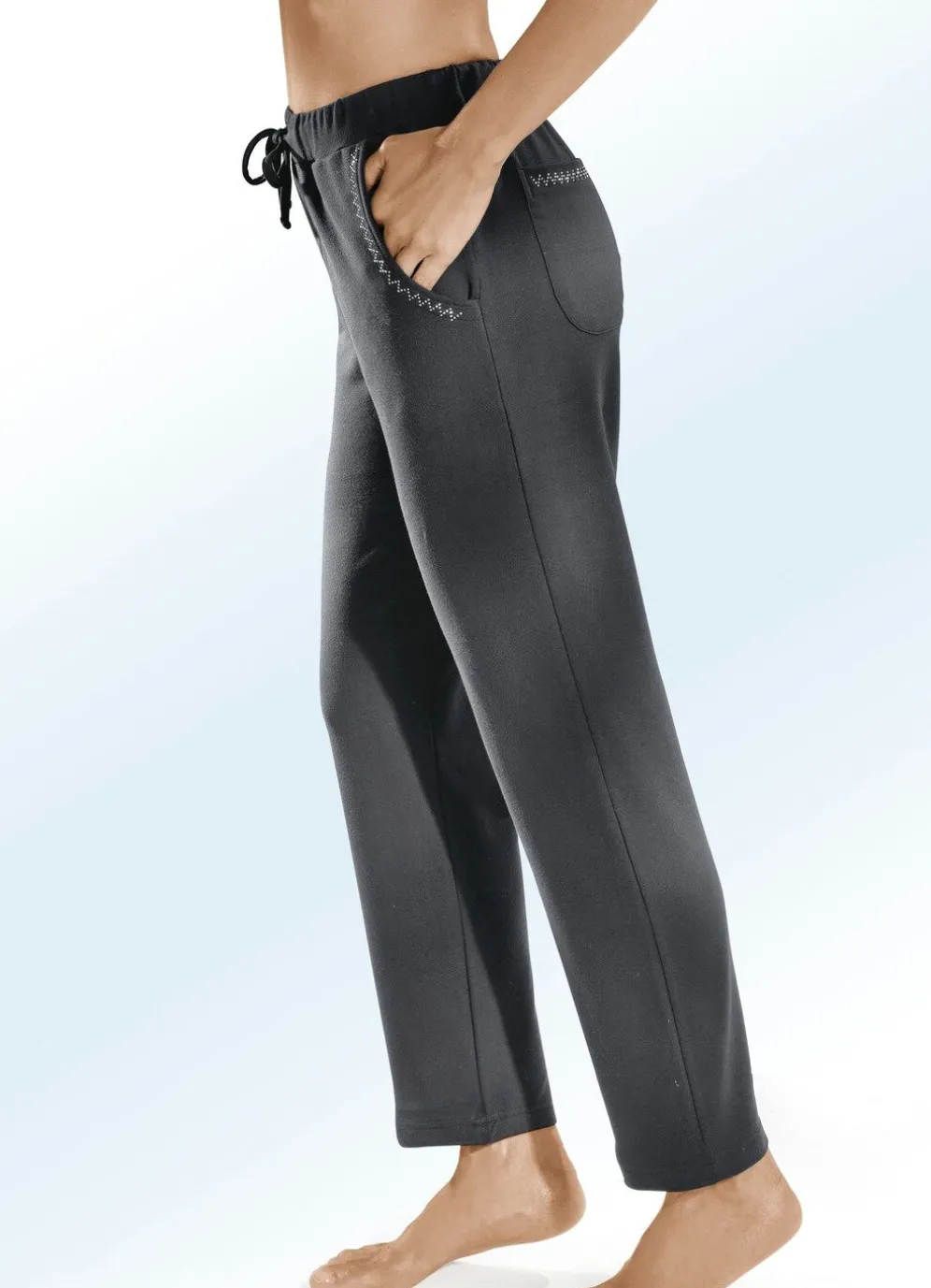 Äußerst tragangenehm ist diese attraktive Hose in langer, gerader Form, mit Tunnelzugband im Vorderteil, bequemem Dehnbund rundum sowie zwei Seitennahttaschen mit dekorativer Nietenzier.