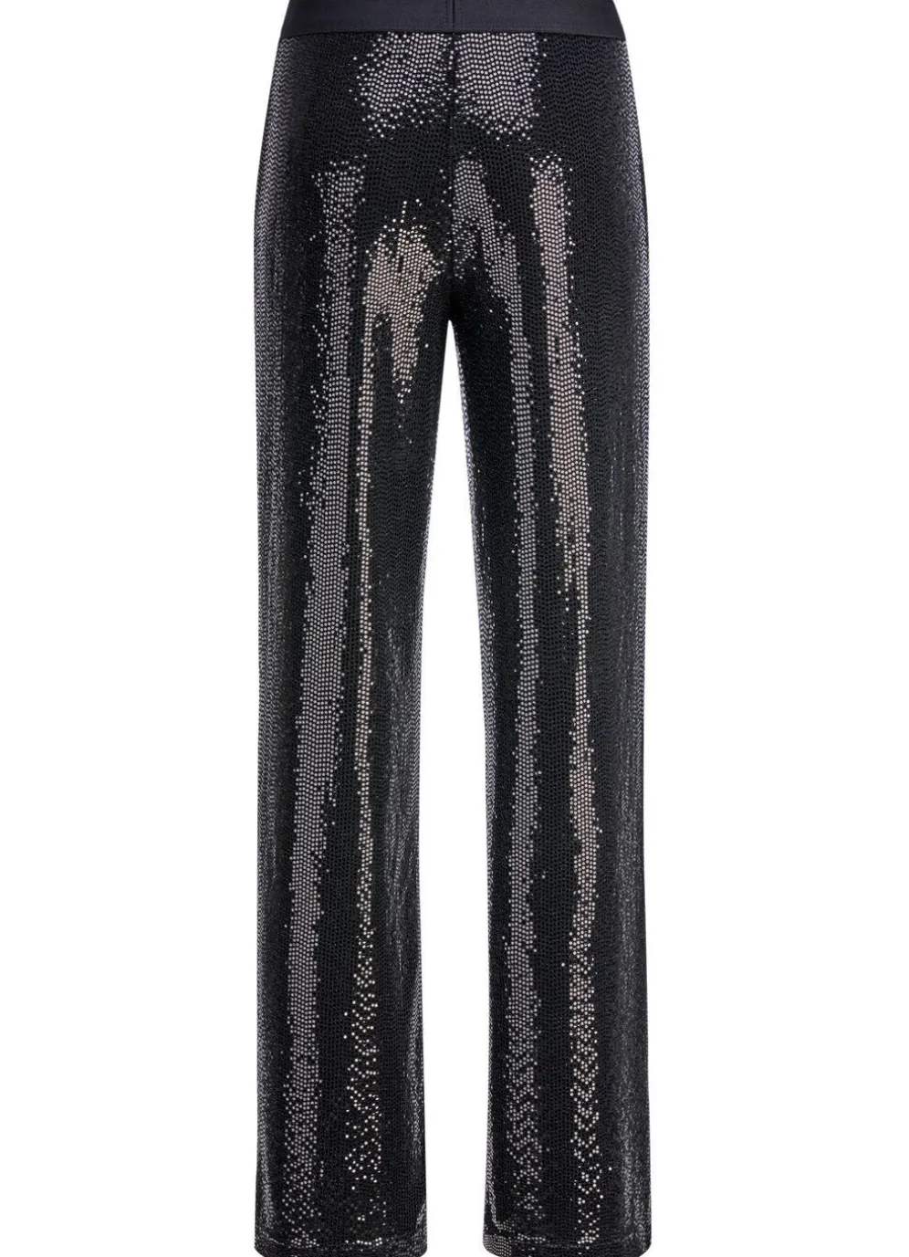 Faszinierende Hose in modischer Weite mit funkelnden Folienpailletten von TIZIA: bequeme Schlupfform, mit uni schwarzem Dehnbund rundum sowie Seitentaschen. Innenbeinlänge ca. 80 cm, Fußweite ab 50 cm.