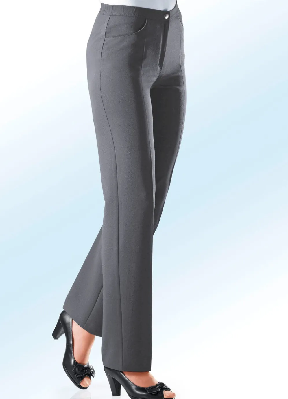Schicke und sehr bequeme Hose mit angenehmem, komfortablem Dehnbund rundum, Haken- und Reißverschluss vorne sowie Seitentaschen. Innenbeinlänge ca. 78cm, Fußweite ab 42 cm.