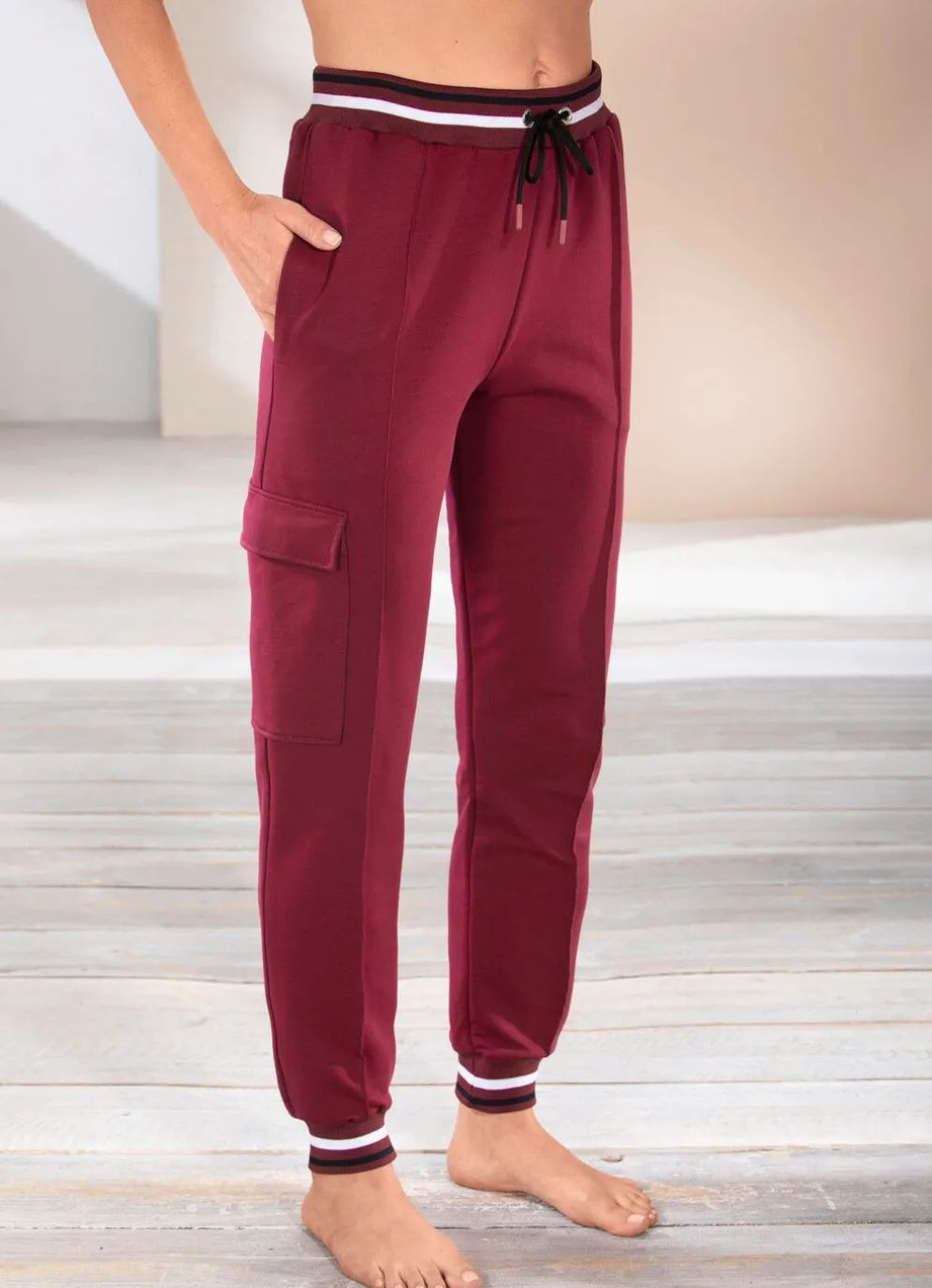 Praktische Hose von „Plantier” in langer Form, mit kontrastfarbenem Dehnbund rundum und Kordelzug, Biesenzier vorne, zwei Seitennahttaschen, eine Cargotasche auf der rechten Seite sowie breiten, kontrastfarbenen Bündchen an den Beinabschlüssen.
