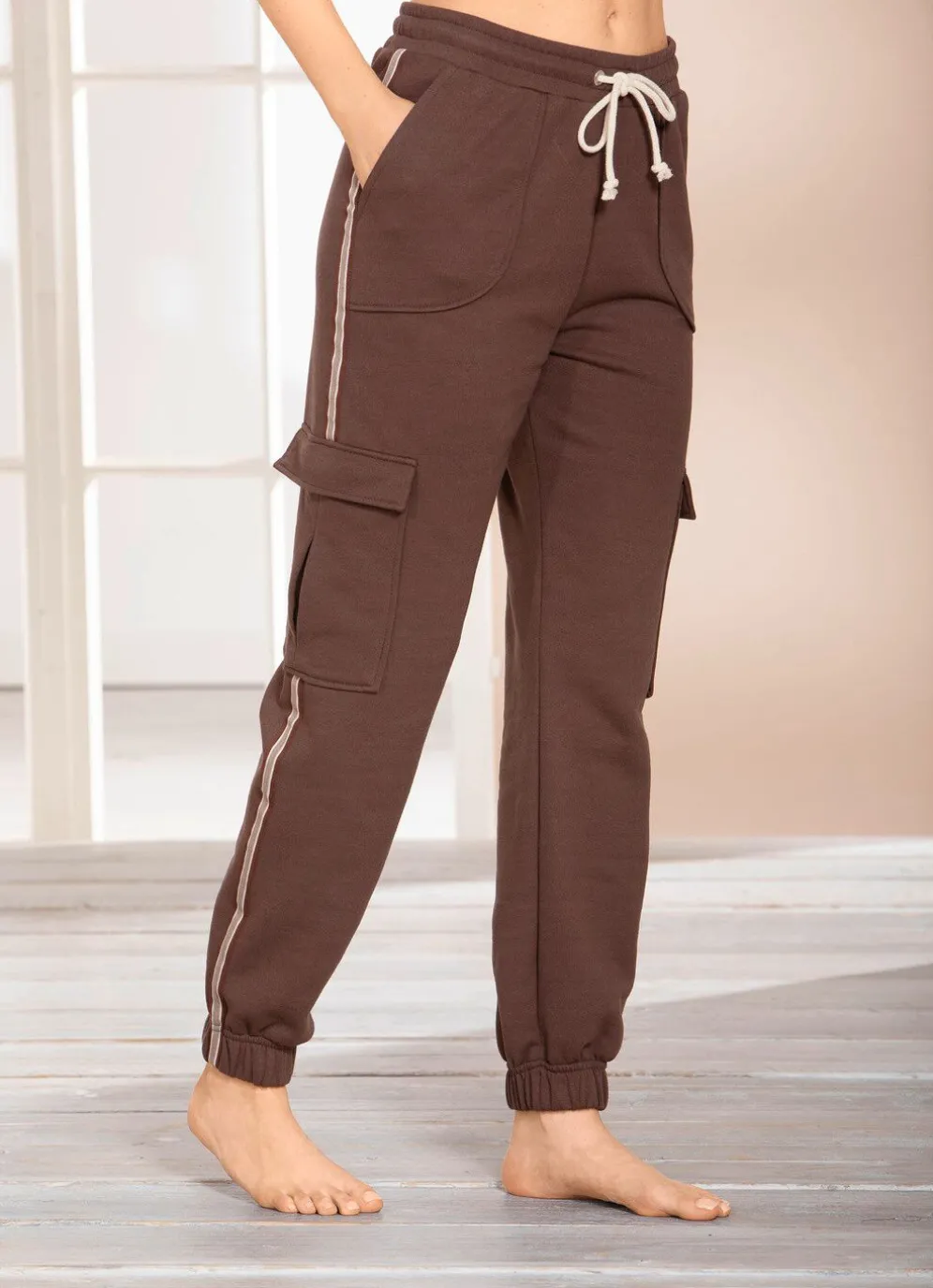 Lässige „Laurina”-Cargo-Hose in langer Form, mit Dehnbund rundum und Kordelzug, innen angerauht, zwei Seitennahttaschen, zwei große, seitliche Cargotaschen sowie elastische Bündchen an den Beinabschlüssen.