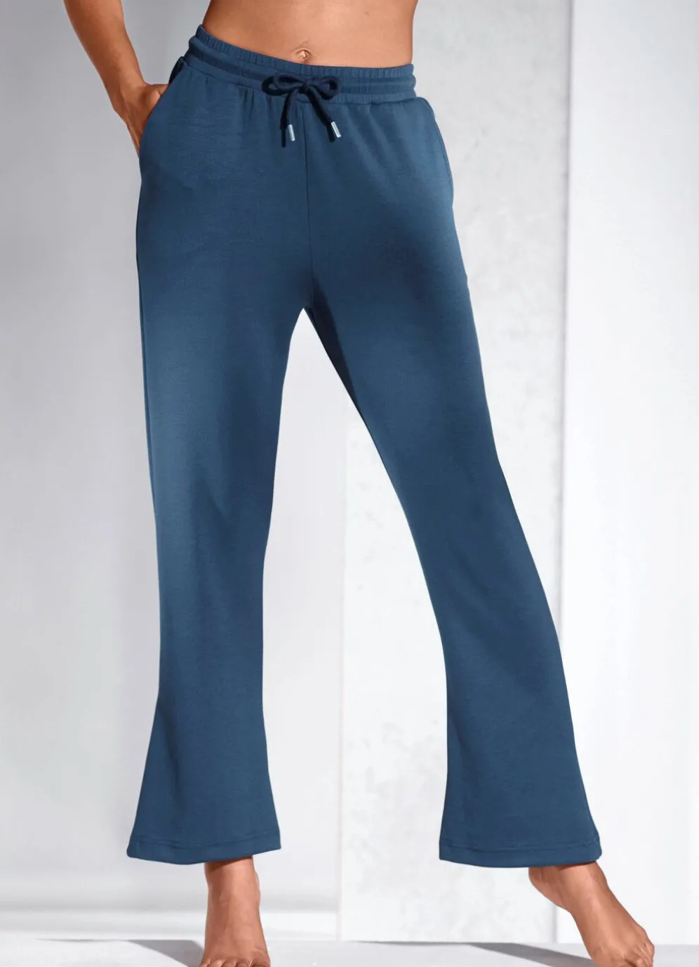 Gemütliche, weiche „Laurina”-Hose in langer Form, mit bequemen Dehnbund rundum, Bindeband, zwei Seitennahttaschen sowie leicht ausgestellter Fußweite.