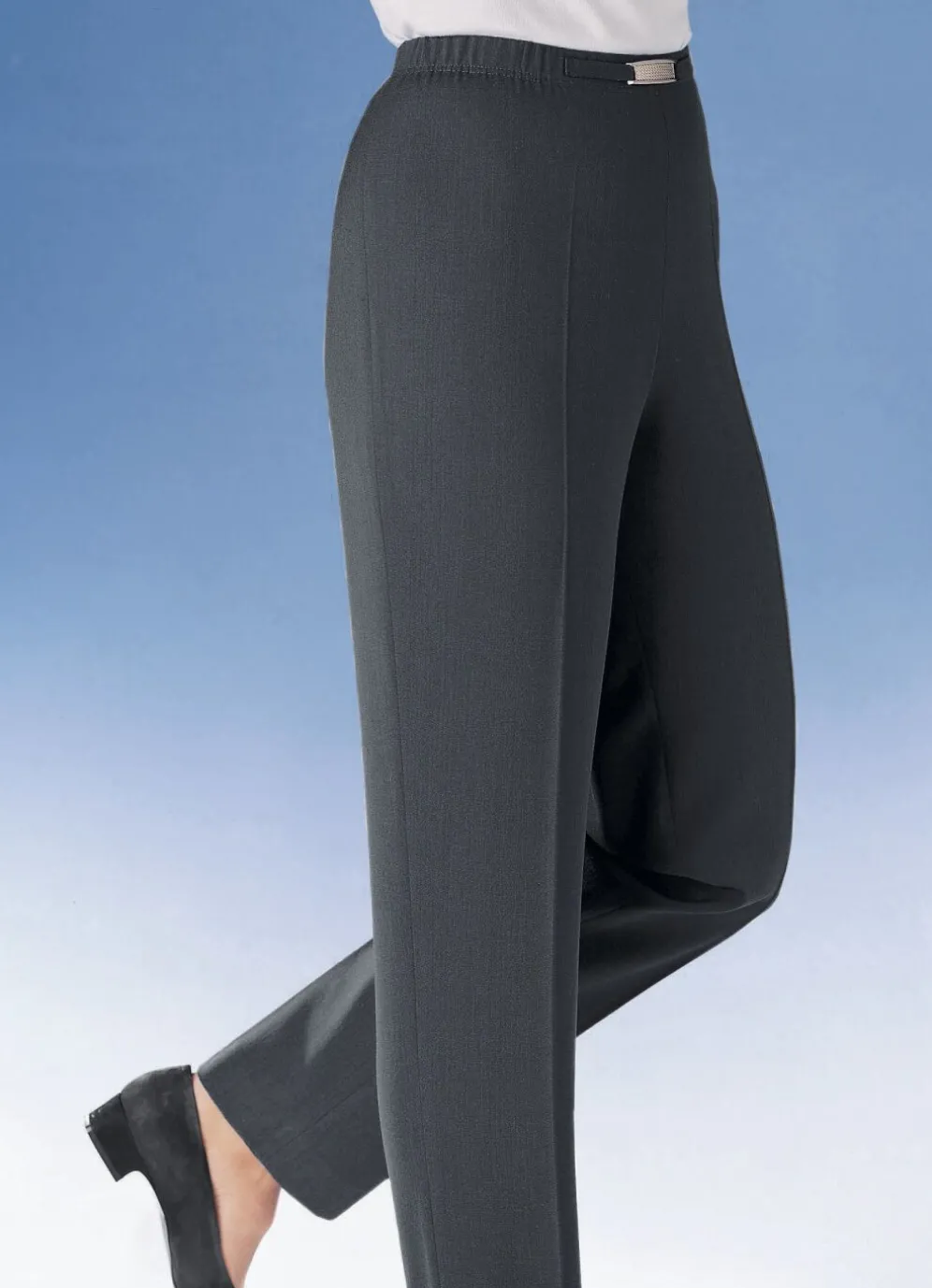 Figurfreundliche Dehnbundhose: komfortable Schlupfform, aparte Metallzier vorne am Bund. Innenbeinlänge ca. 76 cm, Fußweite ab 39 cm.
