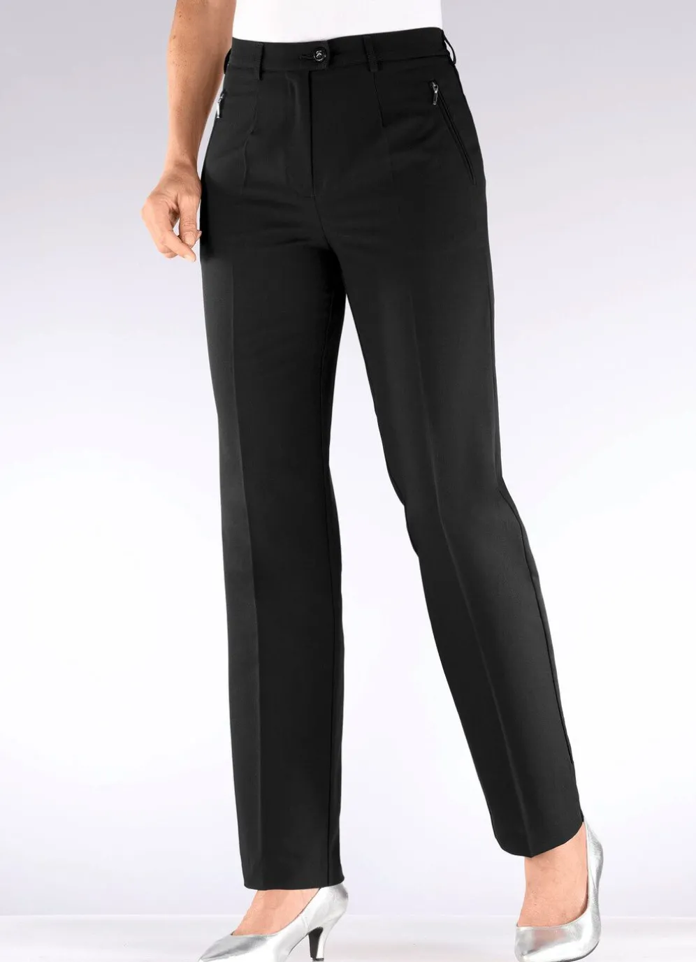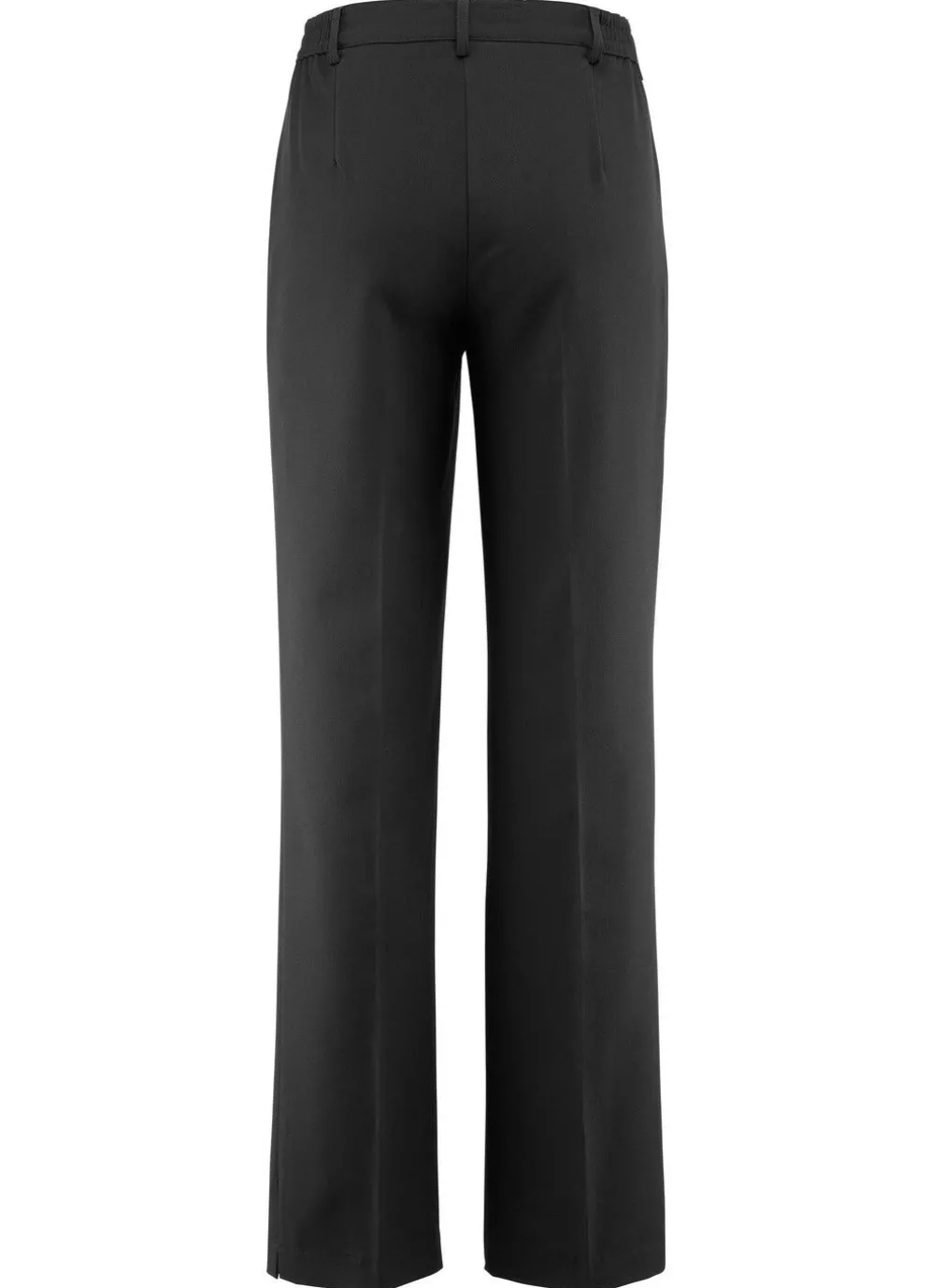 Stilsichere Hose mit angesetztem Formbund und seitlichen Dehnbundeinsätzen, Gürtelschlaufen, Knopf-, und Reißverschluss, Seitentaschen mit Reißverschluss sowie seitlichen Schlitzen an den Beinabschlüssen. Innenbeinlänge ca. 79 cm, Fußweite ab 40 cm.