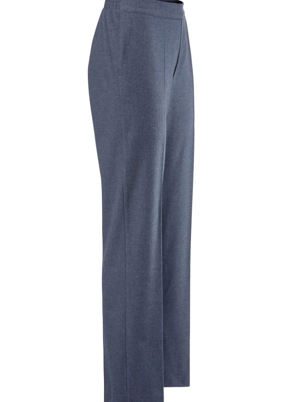 Trendgenau, hellgrau melierte Hose in modischer Weite von Stilschmiede: bequeme Schlupfform, rückwärtiger Dehnbundeinsatz, vordere, glatte Bundverarbeitung sowie Seitentaschen. Innenbeinlänge ca. 78 cm, Fußweite ab 42 cm.