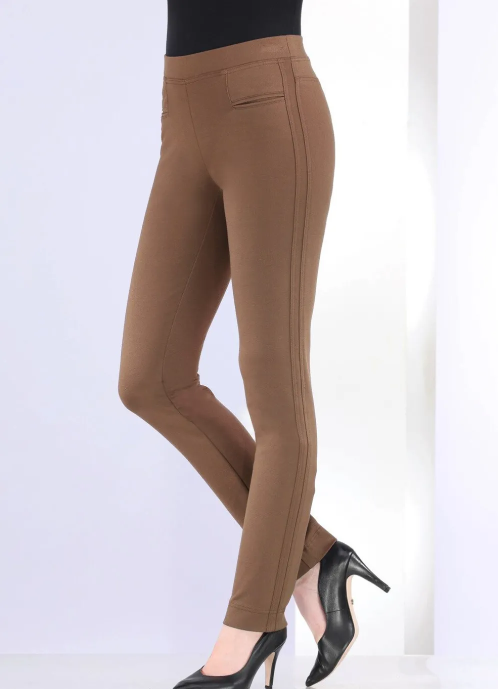 Trendgenaue, hochelastische Hose in Viola mit aktueller, schmaler Beinweite, die für eine schlanke Silhouette sorgt: komfortable Schlupfform, glatt anliegend dank des innenliegenden, unsichtbaren Rundum-Dehnbundes, vordere, paspelierte Taschen sowie Einsätze mit Teilungsnähten und dekorativen Ziersteppungen im Vorderteil sowie figurformende Passe im Rückteil. Innenbeinlänge ca. 76 cm, Fussweite ab 30 cm.