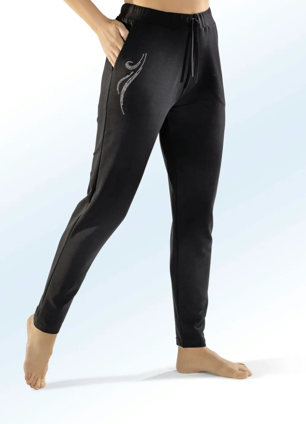 Schicke, schwarze PLANTIER-Hose in langer, gerader Form, mit Tunnelzugband am bequemem Dehnbund rundum, Schmucksteinzier im Vorderteil sowie zwei Schubtaschen.