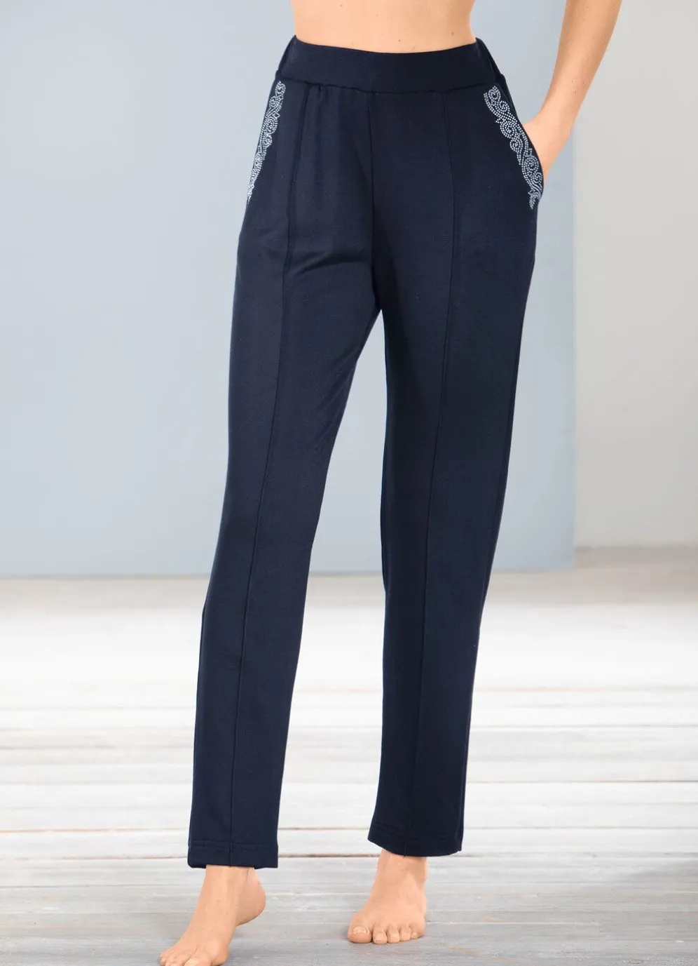Komfortable „Plantier”-Hose in langer Form mit breitem Dehnbund rundum sowie hübscher Schmuck- steinzier an den zwei Schubtaschen.