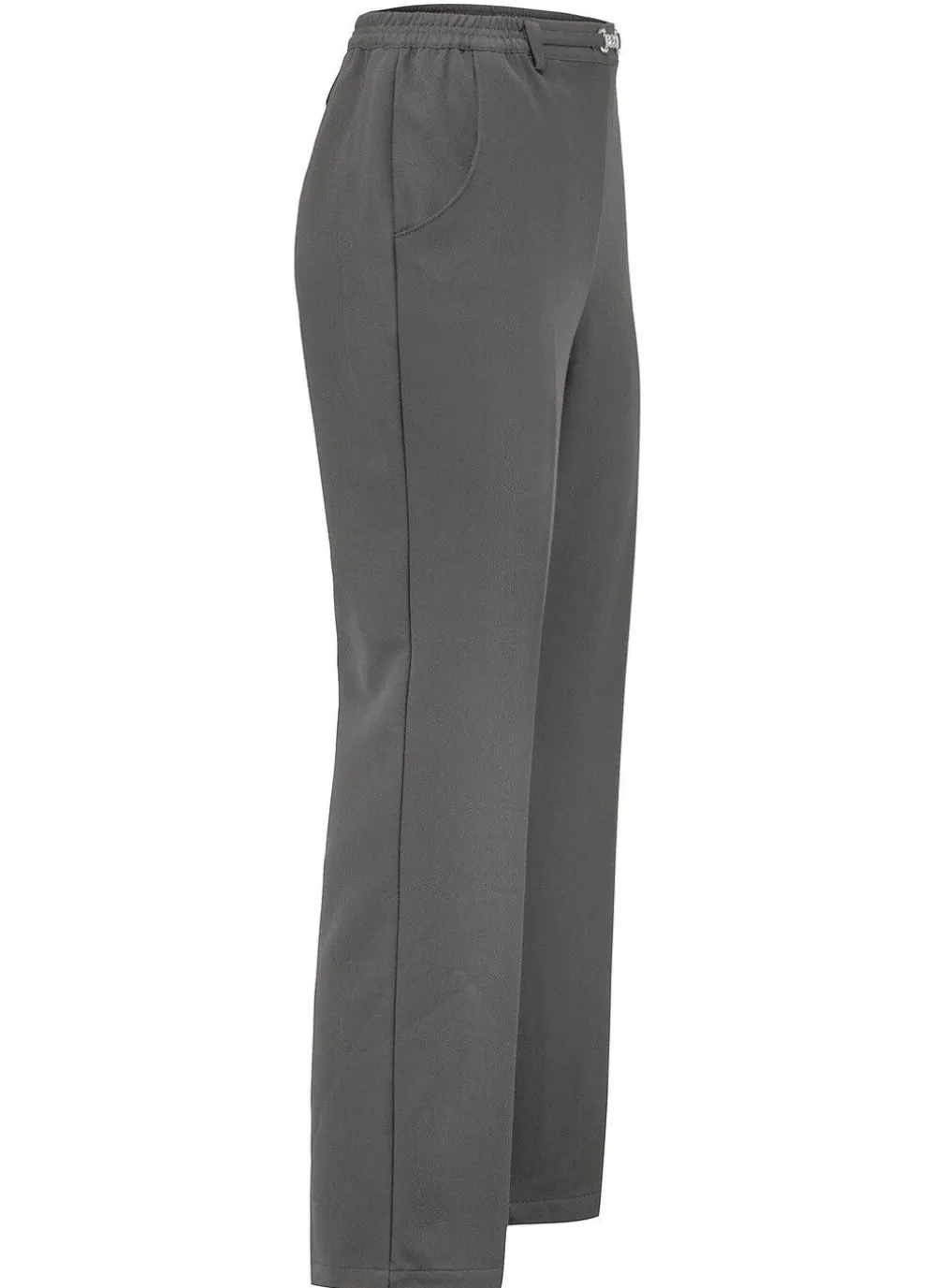 Schicke, knöchellange Hose: bequeme Schlupfform, Dehnbund rundum mit vorderem, glattem Teilstück, schmückendes Zierteil vorne am Bund sowie Seitentaschen. Innenbeinlänge ca. 71 cm, Fußweite ab 40 cm.