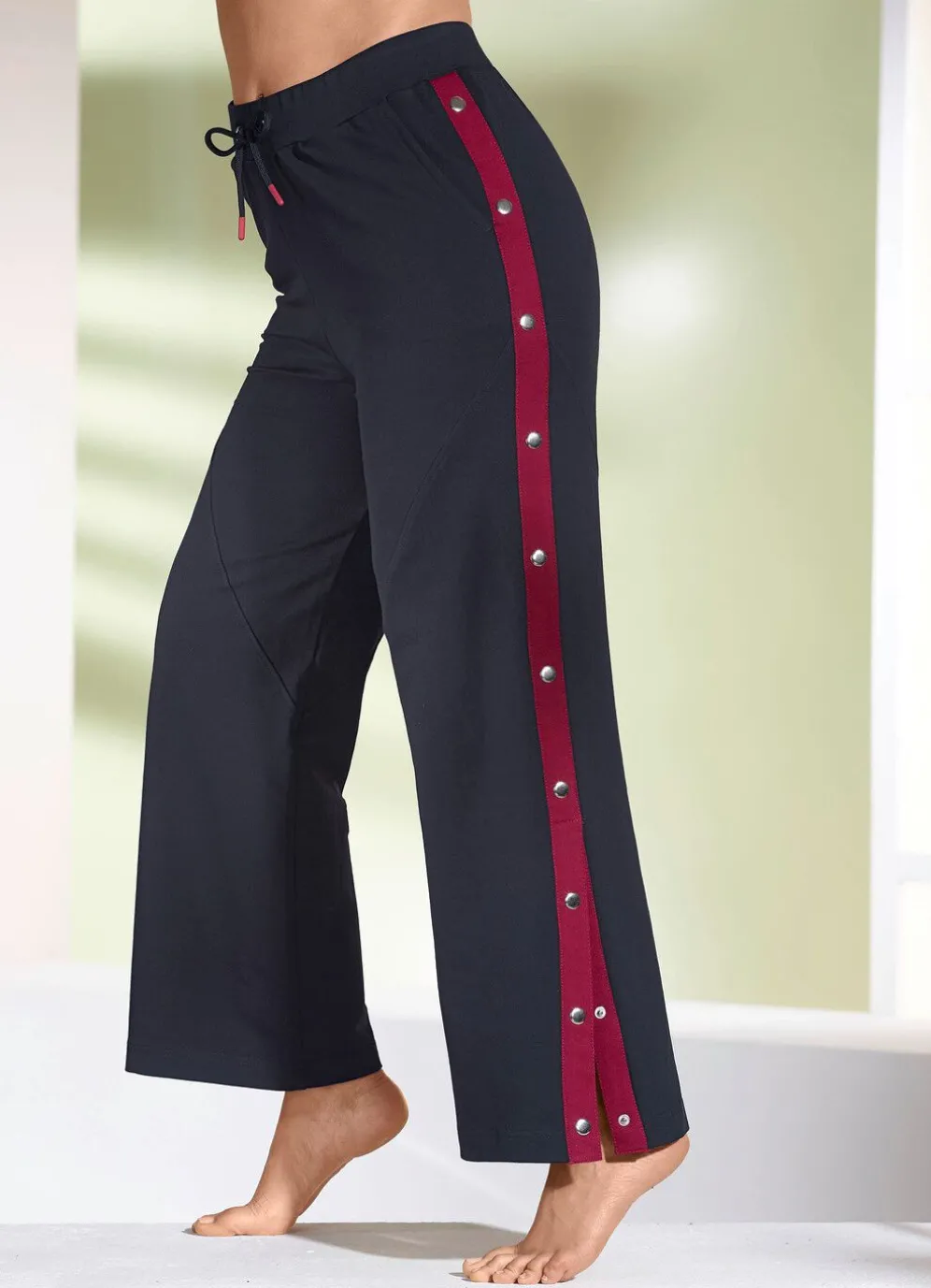 Weite, aufwendig gearbeitete „Plantier”-Hose in langer, gerader Form mit bequemem Dehnbund und Kordelzug rundum, zwei Eingriffstaschen sowie Kontrasteinsätze an der Seitennaht mit Knöpfe. Die unteren drei Knöpfe ermöglichen einen einfachen, komfortablen Zugang zum Fuß.
