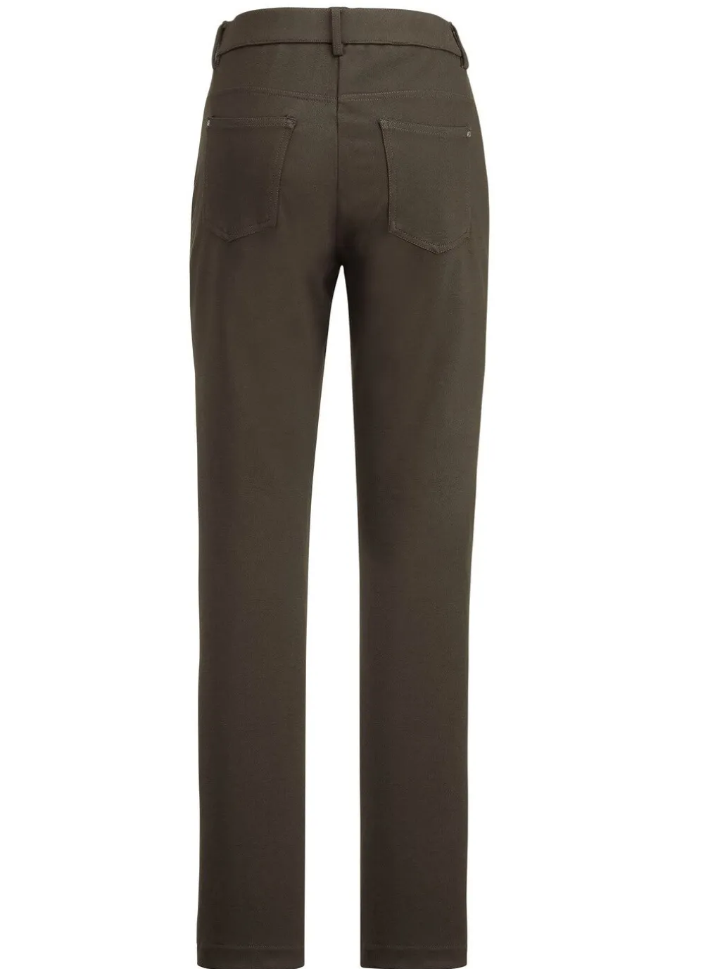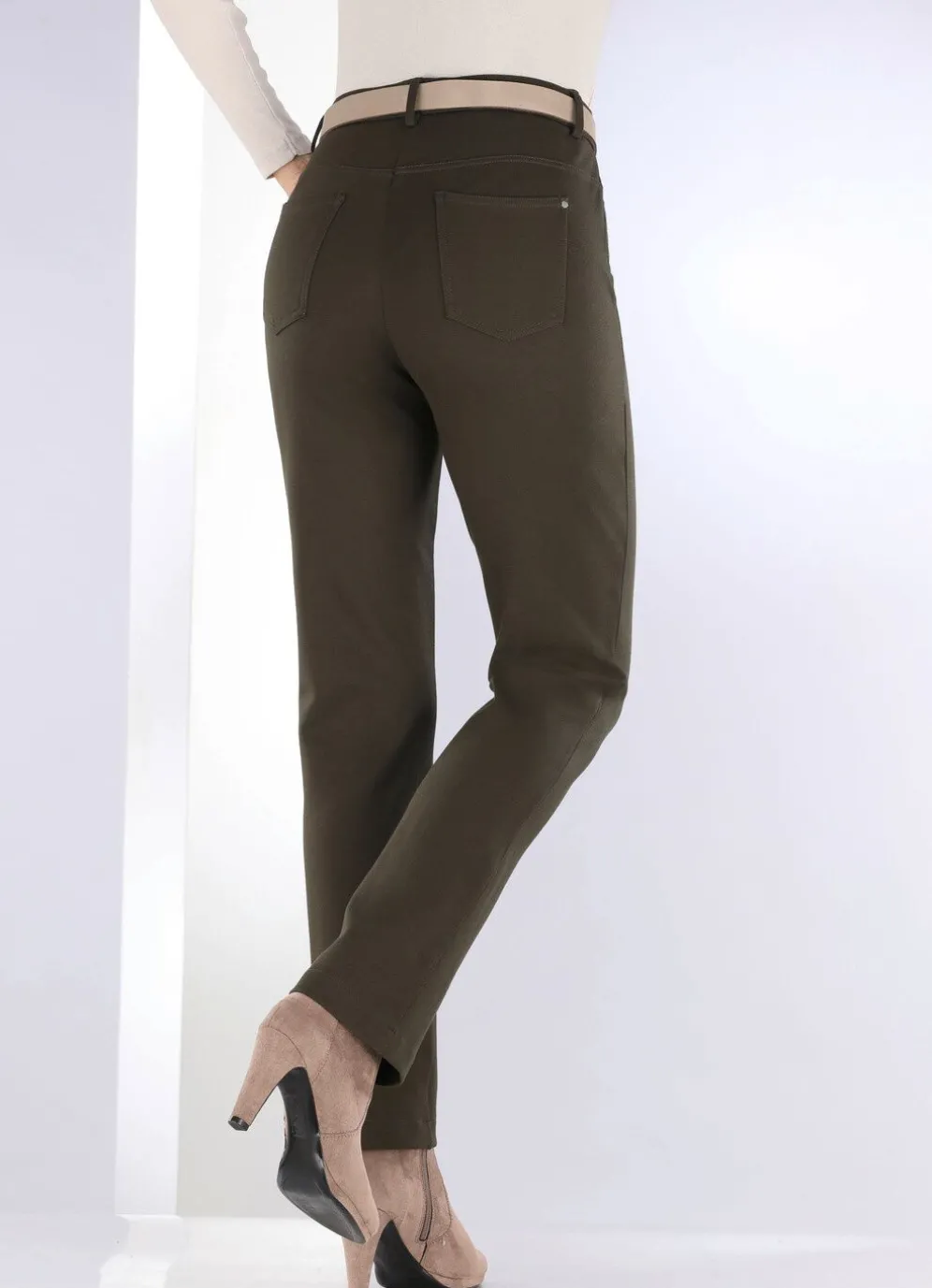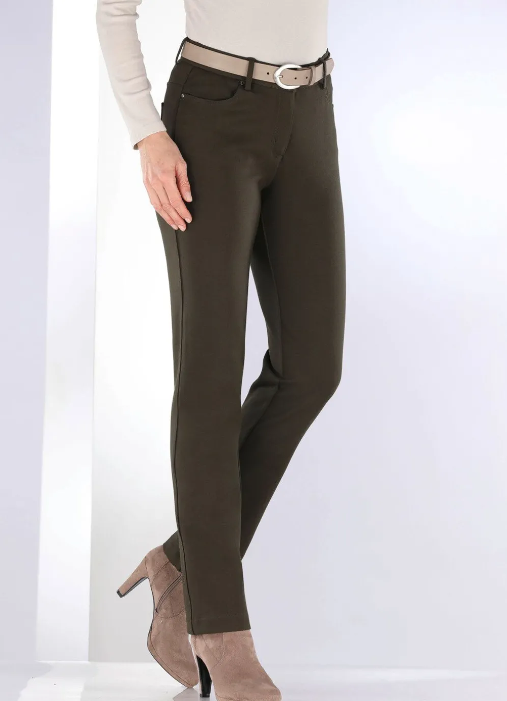 Mit sportivem Chic präsentiert sich diese hochelastische Hose: elastischer Bund, Gürtelschlaufen, Knopf- und Reißverschluss, Seitentaschen, aufgesetzte Gesäßtaschen sowie figurformende Passe im Rückteil. Innenbeinlänge ca. 77 cm, Fußweite ab 38 cm.
