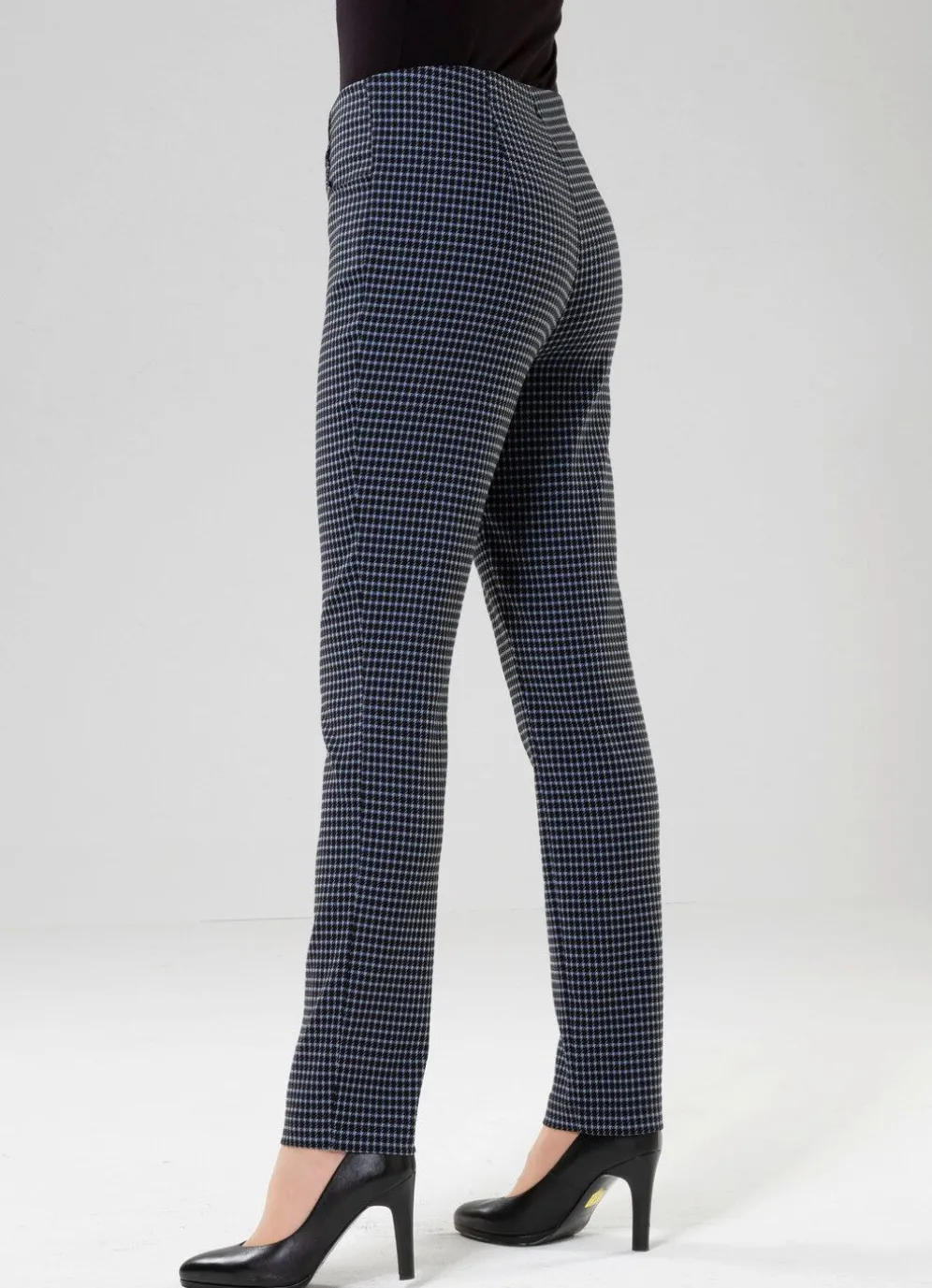 Angesagte Hose mit trendiger Hahnentritt-Dessinierung: in bequemer Schlupfform, figurformend durch den angeschnittenen Bund, glatt anliegend dank der innenliegenden Gummibund-Einlage sowie Seitentaschen. Innenbeinlänge 78 cm, Fußweite ab 32 cm.
