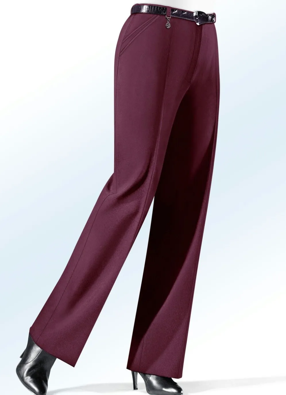In bester Qualität und Verarbeitung zeigt sich diese attraktive Hose mit modisch ausgestellter Fußweite: rückwärtige Dehnbundeinsätze, aparter Zieranhänger an einer der vorderen Gürtelschlaufen, Haken- und Reißverschluss sowie Seitentaschen mit interessantem Blenden-Effekt. Innenbeinlänge ca. 79 cm, Fußweite ab 54 cm.