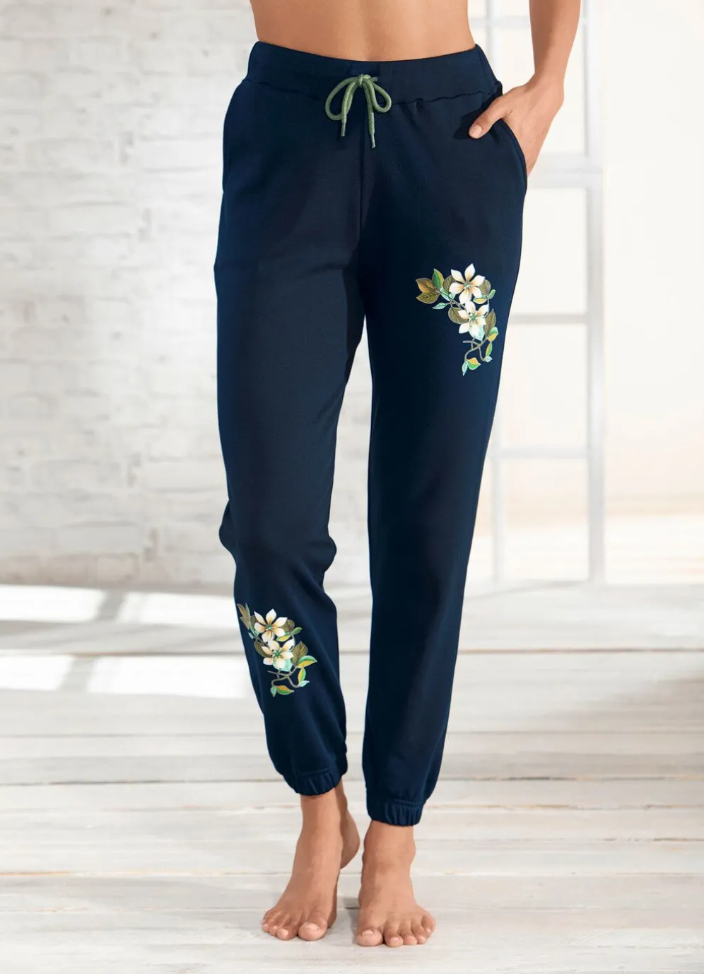 Lange Plantier-Hose mit Dehnbund rundum und Bindeband, Blütenzier an den vorderen Beinbereichen, zwei Schubtaschen sowie Gummizüge an den Beinabschlüssen.