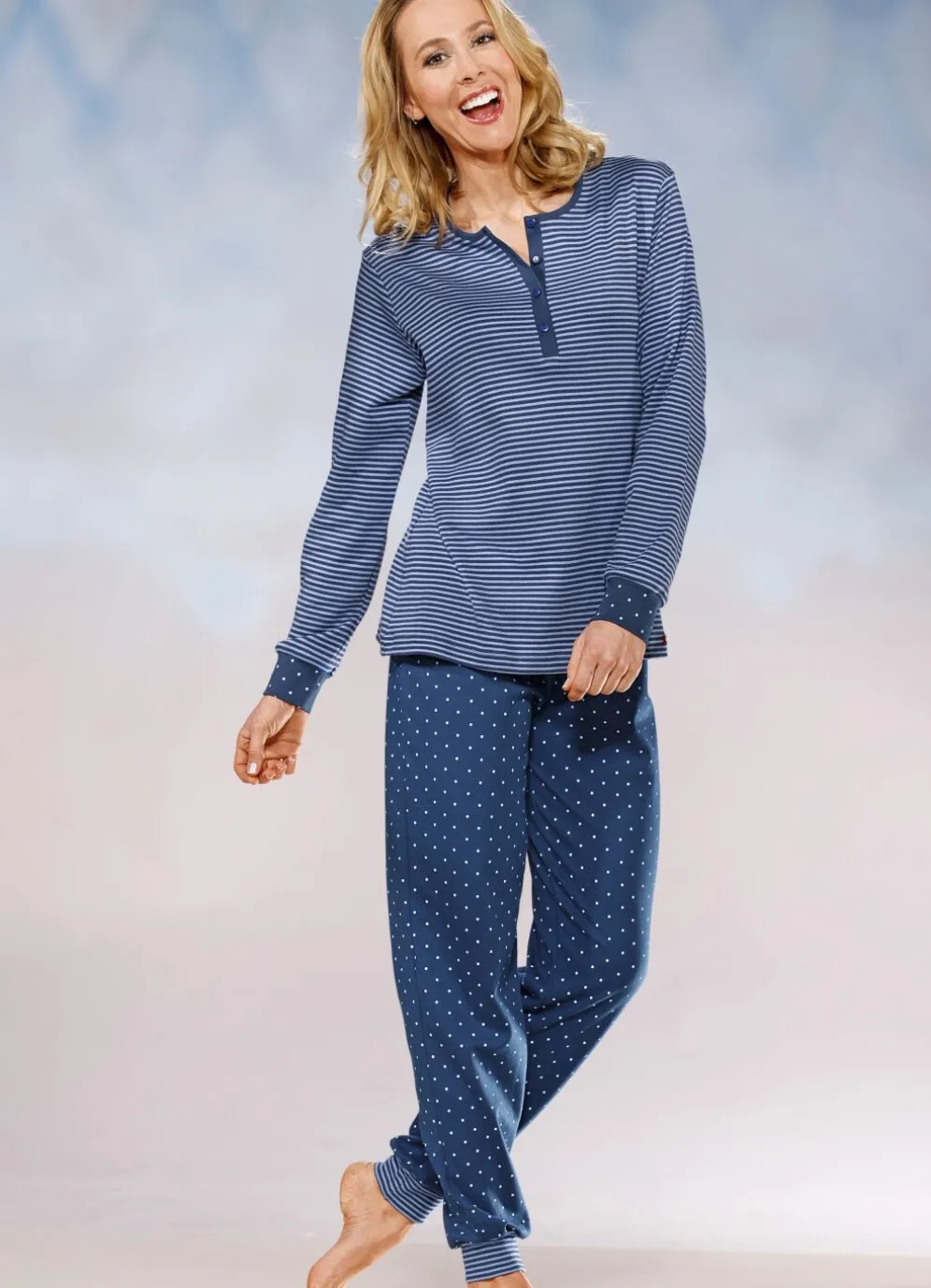Wunderbar bequemer Schlafanzug mit Bündchenabschlüssen an den langen Ärmeln und an der langen Hose mit breitem Dehnbund. Oberteil mit garngefärbtem Ringeldessin, Knopfleiste sowie innerem Rückensattel.