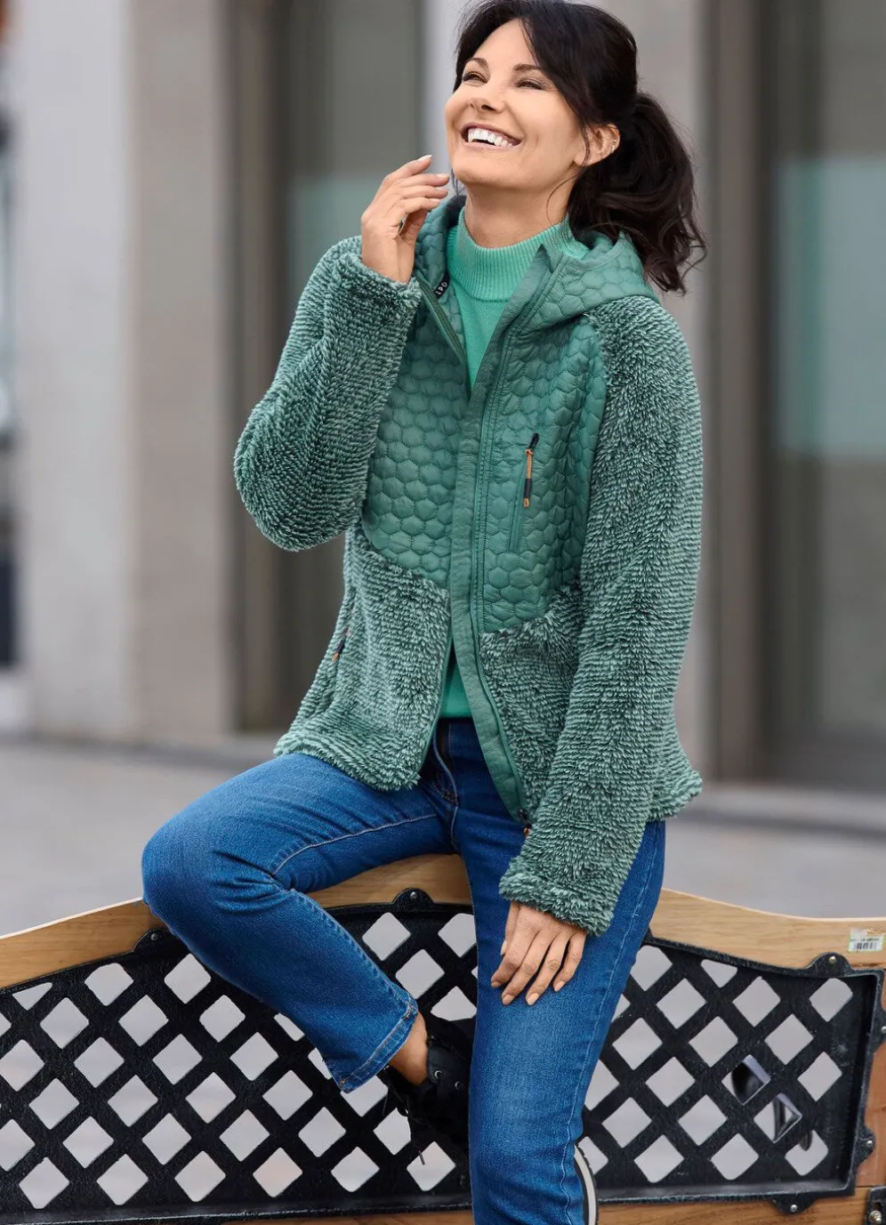 Kuschelige Jacke im aktuellen Materialmix: feste Kapuze, durch Reißverschluss hoch schließbarer Stehkragen, Reißverschlusstaschen, Reißverschluss an der Brusttasche sowie leicht verlängertes, abgerundetes Rückteil. Länge ca. 70 cm, jede weitere Gr. 1 cm länger.