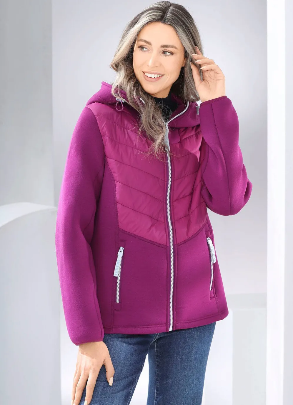 Trendige, zyklamfarbene Jacke im aktuellen Materialmix mit Durchzugsband und Stopper an der festen Kapuze, Reißverschlussleiste sowie Taschen mit Reißverschluss. Länge ca. 60 cm, jede weitere Größe 1,5 cm länger.