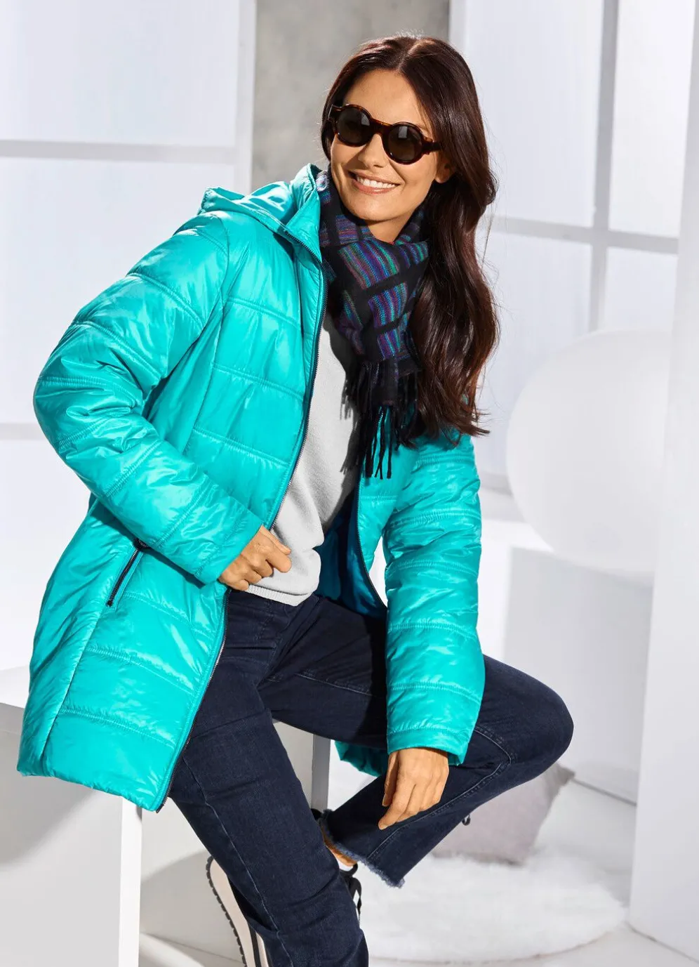 Einfach klasse ist diese umwerfende Longjacke mit abnehmbarer Kapuze, durch 2-Wege-Reißverschluss hoch schließbarem Stehkragen, Reißverschlusstaschen sowie einer Innentasche. Länge ca. 84 cm.