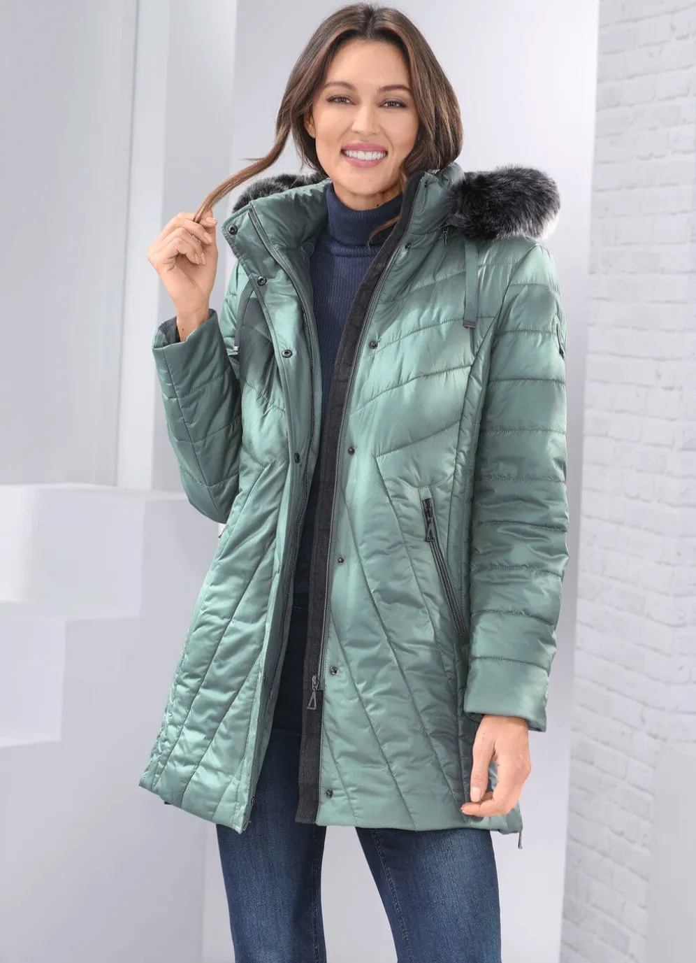 Jacke in Jadegrün, mit figurschmeichelnder Längssteppung seitlich: abnehmbare Kapuze mit Durchzugsband, Stopper und abnehmbarem Kunstpelz-Besatz, durch Reißverschluss unter der Druckerleiste hoch schließbarer Stehkragen, Reißverschluss an den Taschen und Seitenschlitzen, umschlagbare Ärmel, eine Innentasche. Länge ca. 82 cm, ab Gr. 42 ca. 84 cm, ab Gr. 46 ca. 86 cm, bei K-Gr. ca. 78 cm, ab Gr. 21 ca. 80 cm, ab Gr. 23 ca. 82 cm.