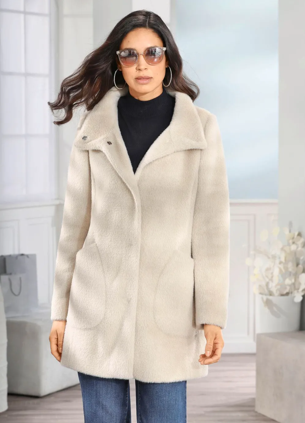 Ein perfekter Begleiter ist diese Jacke in Beige, mit aparter Kragenlösung, elegant verdeckter Druckerleiste, aufgesetzten Taschen sowie einer Innentasche. Länge ca. 80 cm, ab Gr. 38 ca. 82 cm, ab Gr. 44 ca. 84 cm, ab Gr. 50 ca. 86 cm.