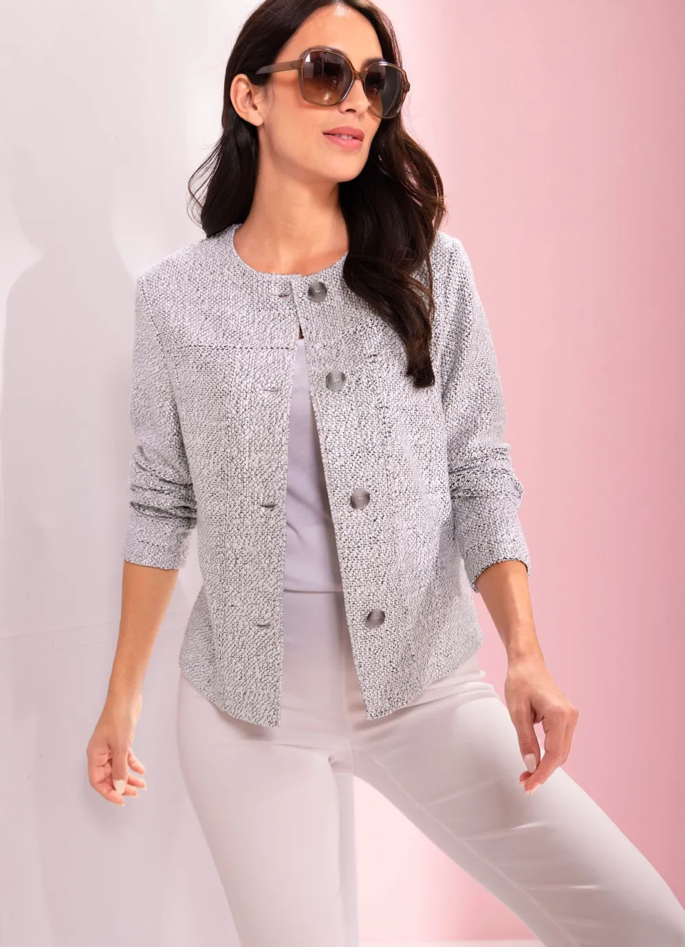 Die Jacke von RABE in Silbergrau überzeugt mit rundem Halsausschnitt, langen Ärmeln, durchgehender Knopfleiste.