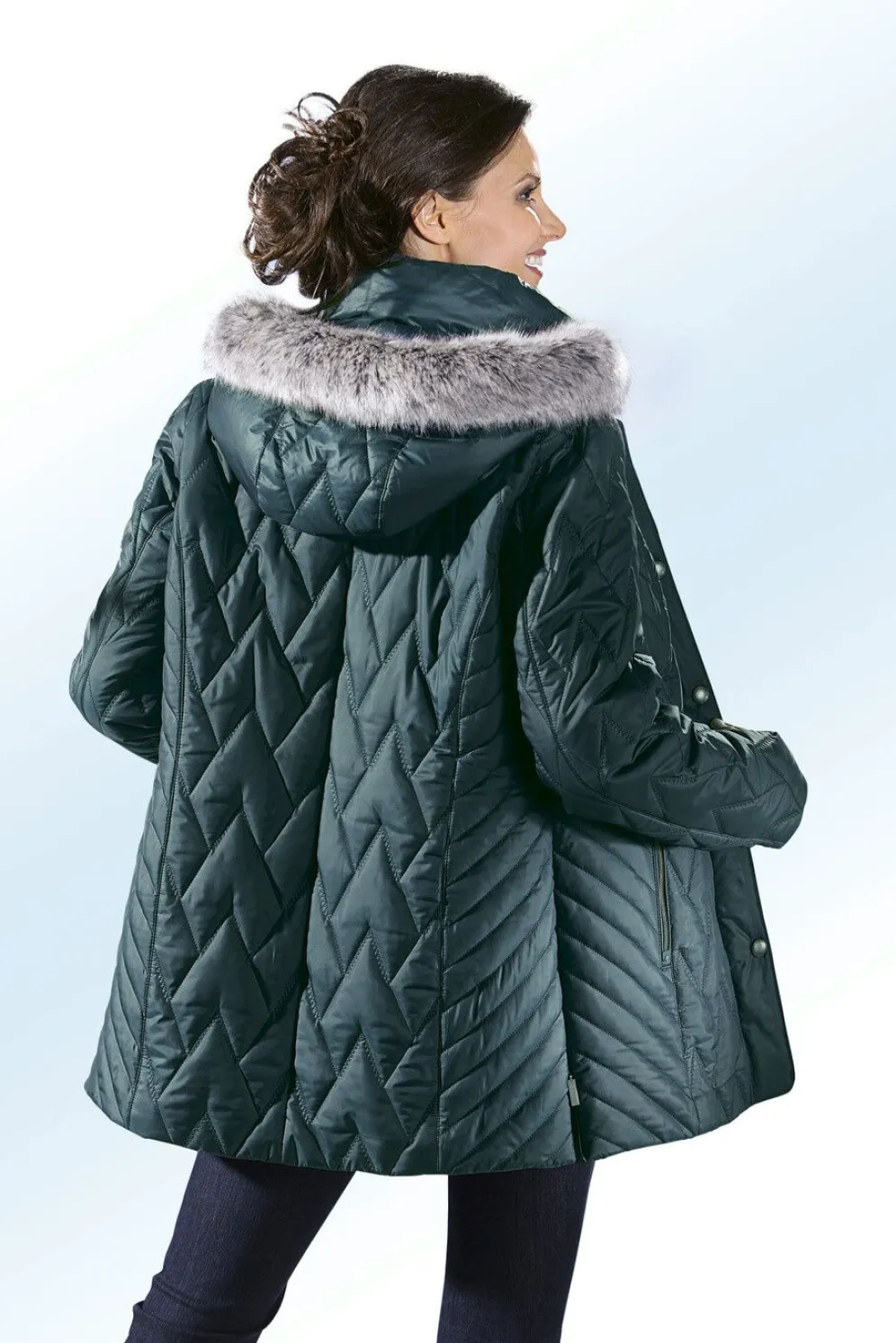 Traumhaft schöne, ausgestellte Jacke mit vielen hochwertigen Details und fabelhaftem Stepp: abnehmbarer Kunstpelz-Besatz an der abnehmbaren Kapuze mit Durchzugsband und Stopper, durch Reißverschluss unter der Druckerleiste hoch schließbarer Stehkragen, Reißverschlusstaschen, umschlagbare Ärmel, Reißverschluss an den Seitenschlitzen sowie eine Innentasche. Länge ca. 80 cm, bei K-Gr. ca. 74 cm.