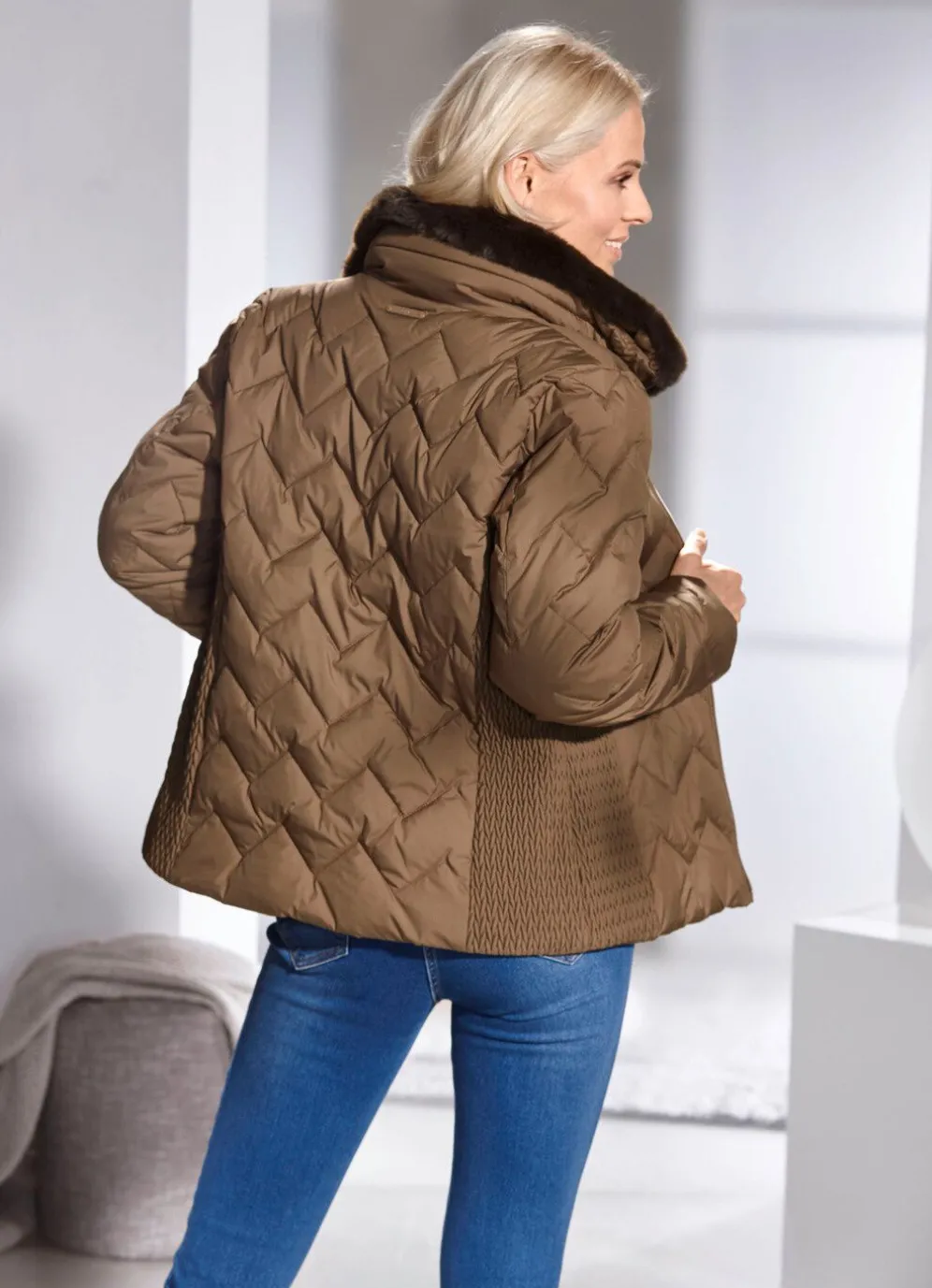 Braune Jacke mit fabelhaftem Zickzack-Stepp, Durchzugsband und Stopper an der im Kragen verstaubaren, festen Kapuze, durch Reißverschluss hoch schließbarem Stehkragen mit abnehmbarem Kunstpelz- Innenbeleg, nahtfeinen Reißverschlusstaschen, seitlichen Smokeinsätzen in Zopfmuster-Optik, Windfangärmeln aus Rippenstrick sowie zwei Innentaschen. Länge ca. 65 cm, ab Gr. 42 ca. 68 cm, ab Gr. 48 ca. 71 cm.