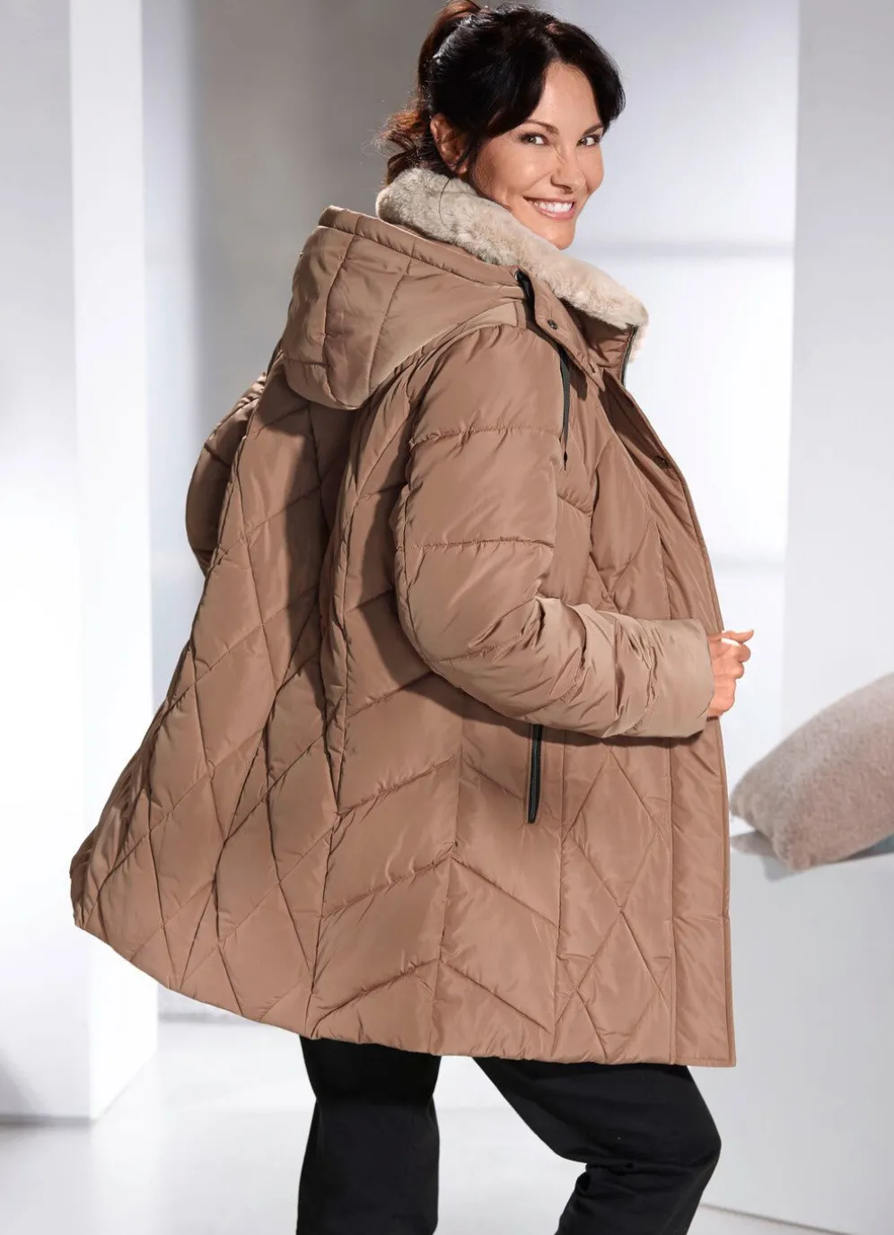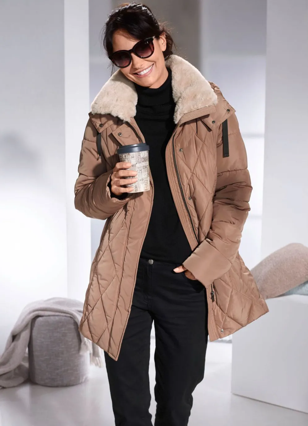 Jacke in Haselnuss, mit Bindeband, Riegel und Druckern an der abnehmbaren Kapuze, durch Reißverschluss unter der verdeckten Druckerleiste hoch schließbarem Stehkragen mit Kunstpelz-Innenbeleg, Reißverschlusstaschen, Windfangärmeln aus Rippenstrick sowie einer Innentasche. Länge ca. 80 cm, ab Gr. 46 ca. 82 cm.