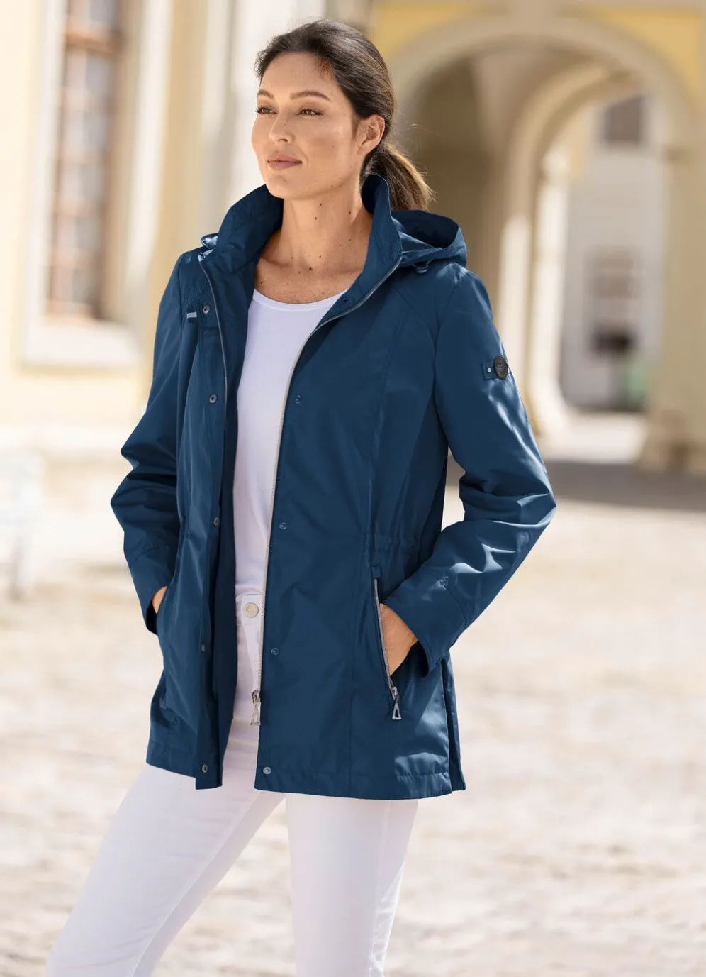 Jacke mit Durchzugsband und Stopper in der abnehmbaren Kapuze und in der Taille, durch Reißverschluss unter der Druckerleiste hoch schließbarem Stehkragen, Reißverschluss an den Taschen und Seitenschlitzen, Zierdruckern an den Abschlüssen der umschlagbaren Ärmel, einer Innentasche sowie eingearbeiteter Passe mit Zierdrucker und kleinem Schlitz im Rückteil. Länge ca. 78 cm, ab Gr. 42 ca. 80 cm, ab Gr. 46 ca. 82 cm, ab Gr. 56 ca. 84 cm.
