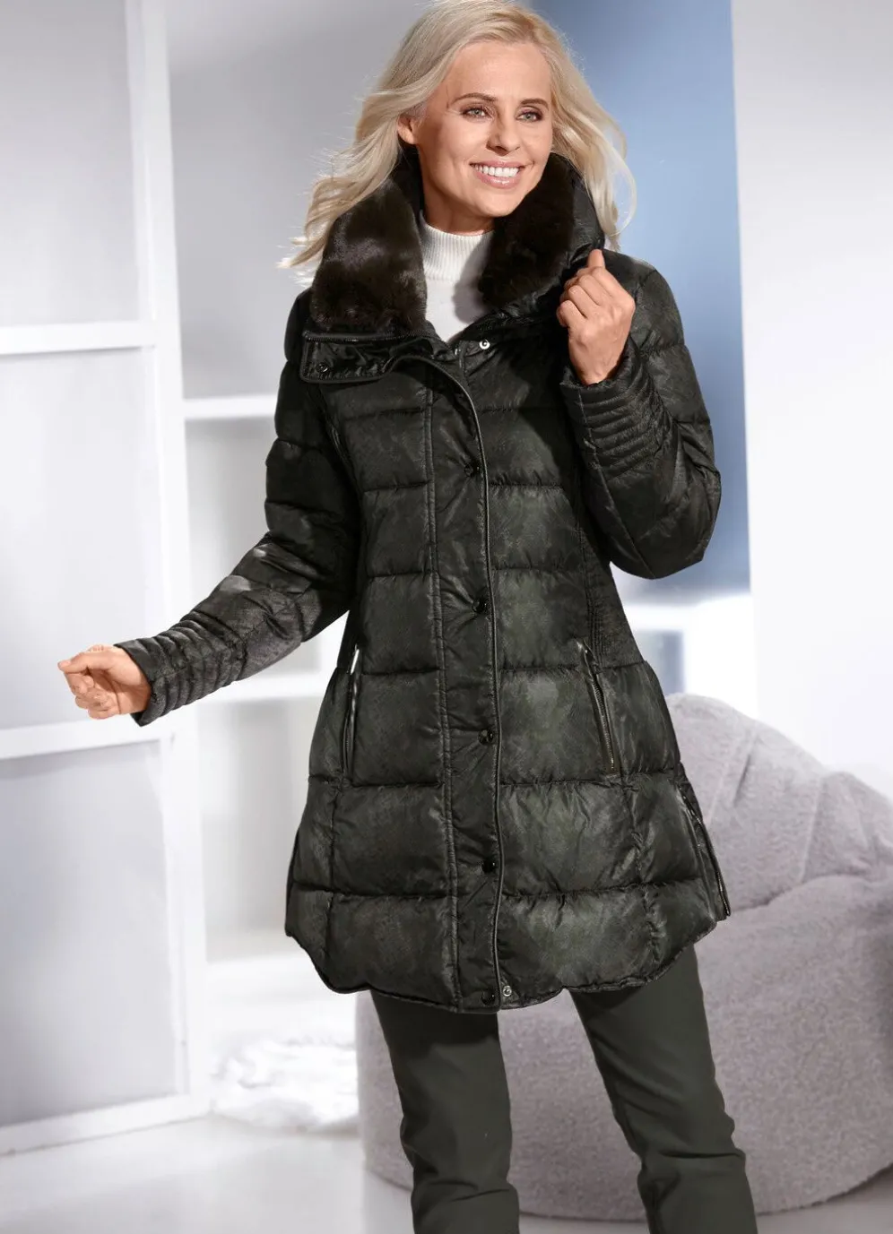 Interessante, olivfarbene Jacke mit trendstarkem Reptildessin in Schwarz: durch 2-Wege-Reißverschluss unter der Druckerleiste hoch schließbarer Stehkragen mit abnehmbarem Kunstpelz-Besatz, Reißverschluss an den Paspeltaschen und Seitenschlitzen, gesmokte Einsätze seitlich sowie eine Innentasche. Länge ca. 82 cm, ab Gr. 44 ca. 84 cm.