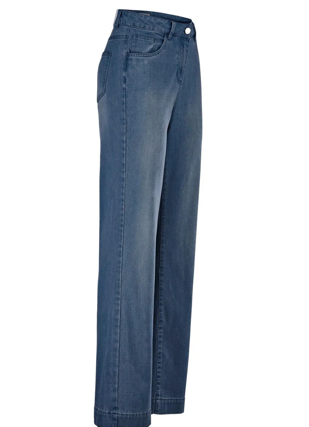 Fabelhafte Jeans in 5-Pocket-Form mit luftig-weitem Bein: elastischer Formbund, Gürtelschlaufen, Knopf- und Reißverschluss, Jeanssattel sowie breiter, abgesteppter Saumabschluss. Innenbeinlänge ca. 78 cm, Fußweite ab 48 cm.