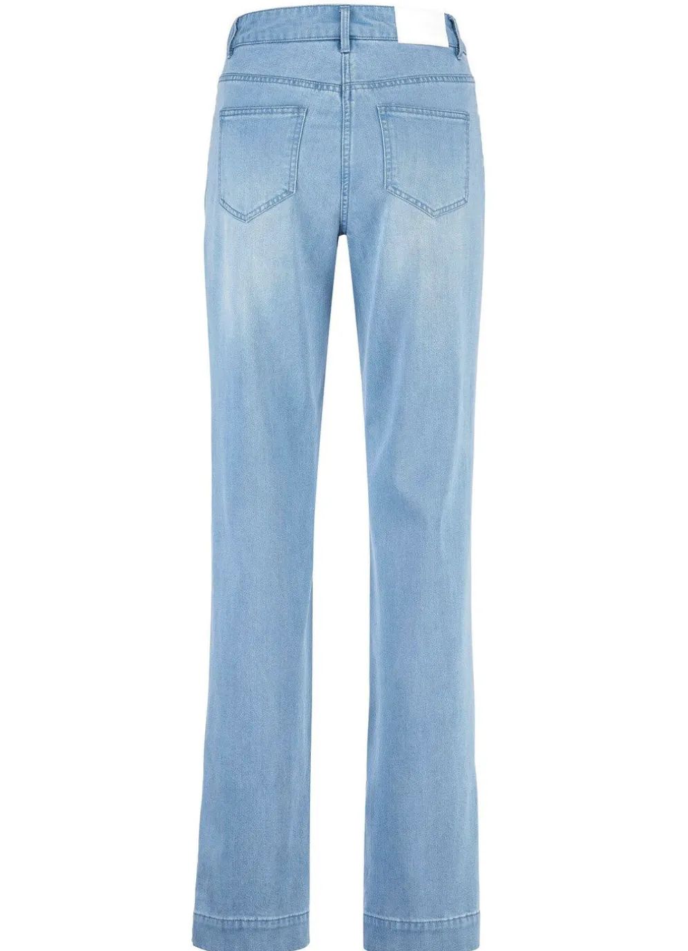 Fabelhafte Jeans in 5-Pocket-Form mit luftig-weitem Bein: elastischer Formbund, Gürtelschlaufen, Knopf- und Reißverschluss, Jeanssattel sowie breiter, abgesteppter Saumabschluss. Innenbeinlänge ca. 78 cm, Fußweite ab 48 cm.