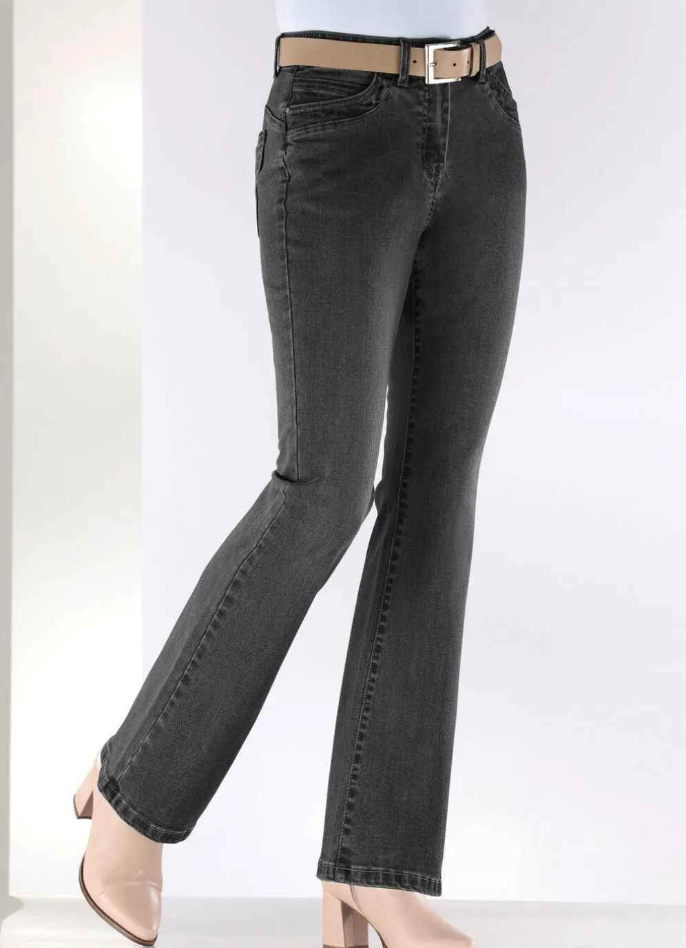 Aktuelle Jeans mit modisch weiterem Beinverlauf in 5-Pocket-Form: elastischer Bund, Gürtelschlaufen, Knopf- und Reißverschluss sowie Jeanssattel. Innenbeinlänge ca. 78 cm, Fußweite ab 47 cm.
