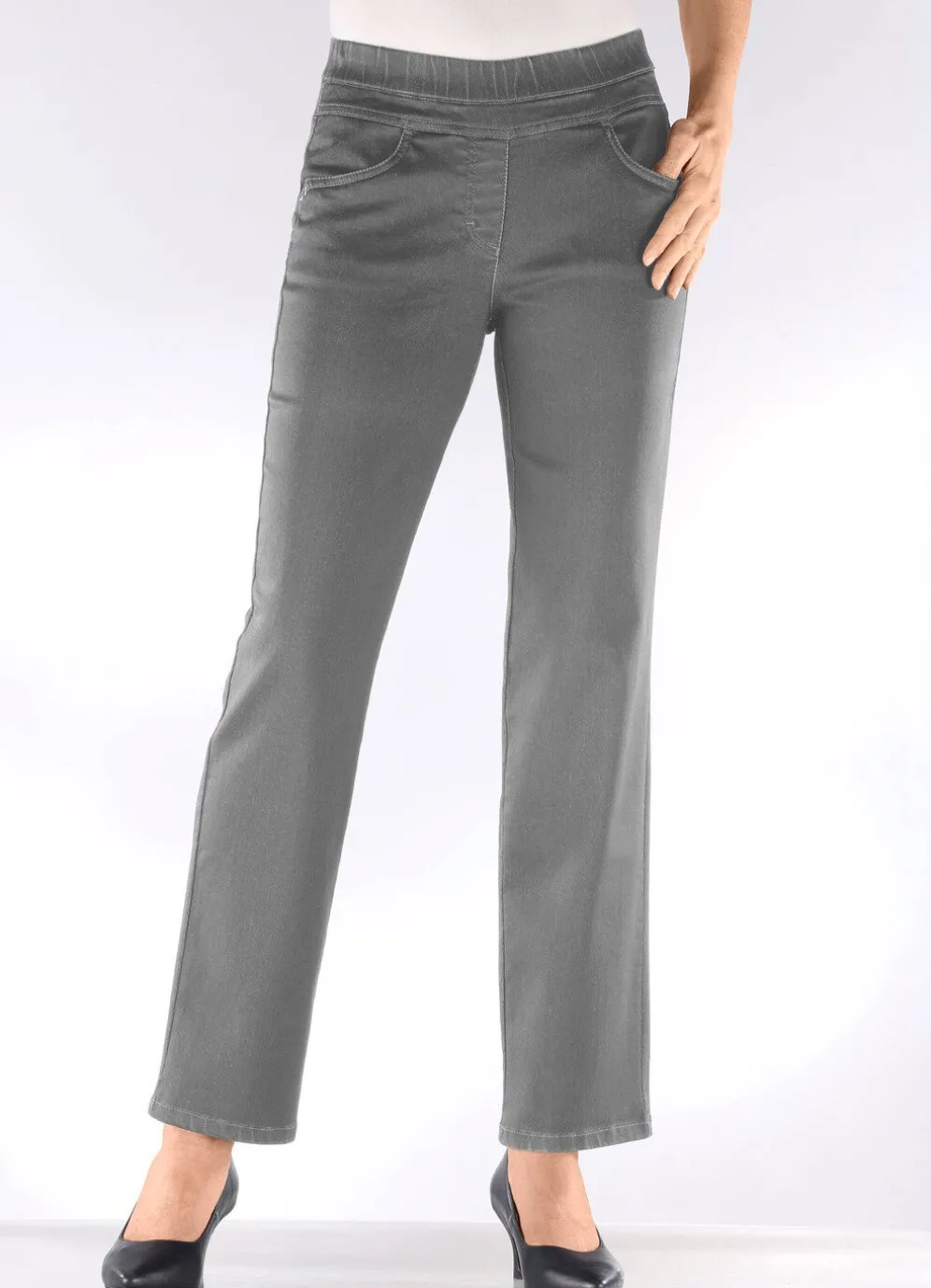 Tragangenehme Jeans: Schlupfform, glatt anliegend dank der innenliegenden Gummibundeinlage, angedeutete Reißverschluss-Zierblende, Seiten- und Kleingeldtasche, aufgesetzte Gesäßtaschen sowie figurformender Jeanssattel im Vorder- und Rückteil. Innenbeinlänge ca. 78 cm, Fußweite ab 40 cm.